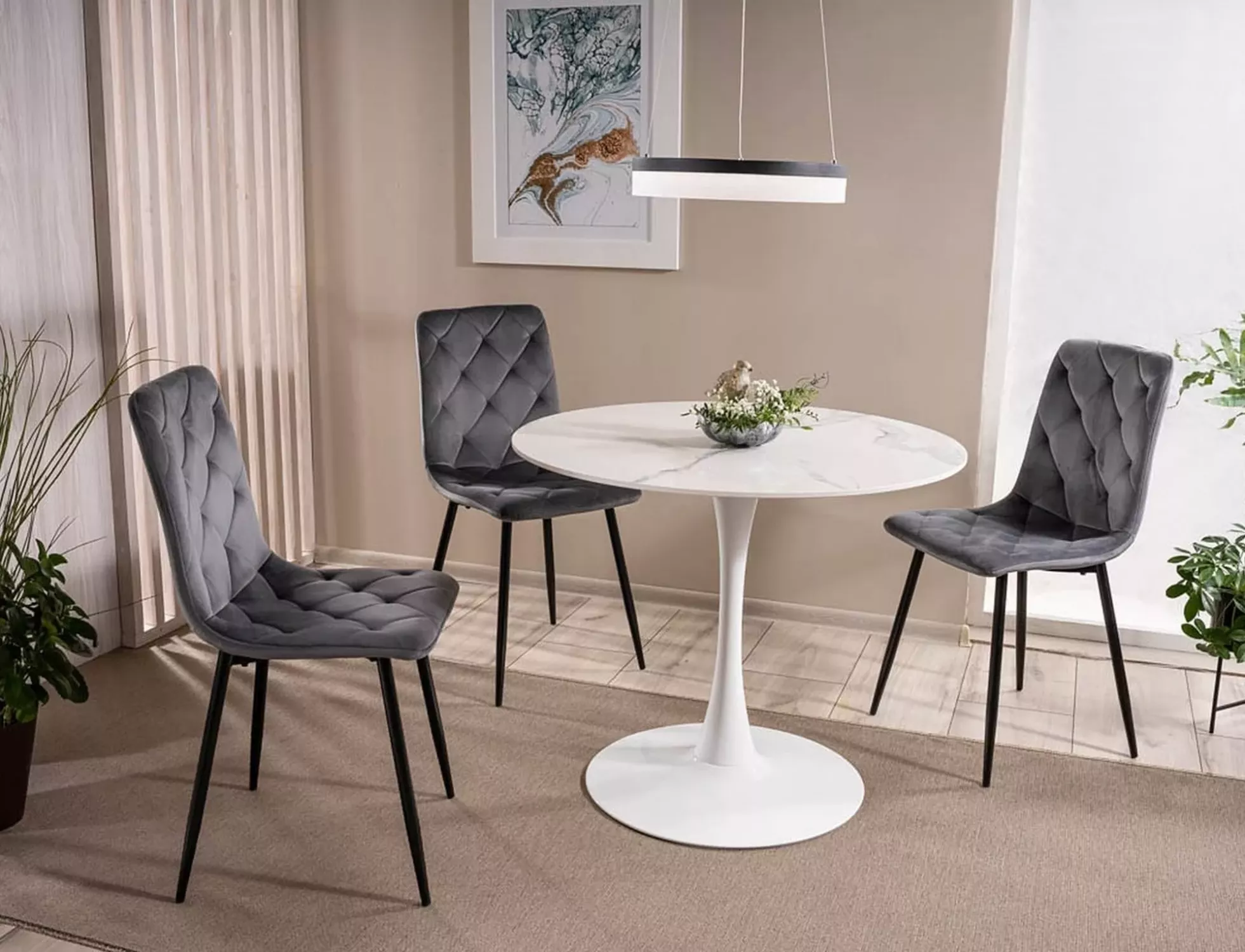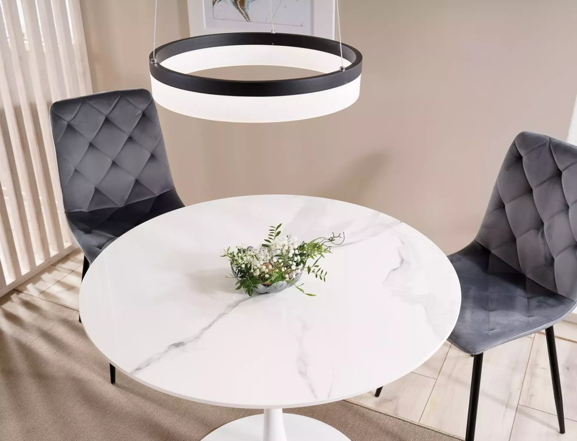 Kulatý jídelní stůl BRODIE skvěle zapadne do všech menších moderních jídelen nebo kuchyní. Stabilitu stolu dodává pevná kovová konstrukce.