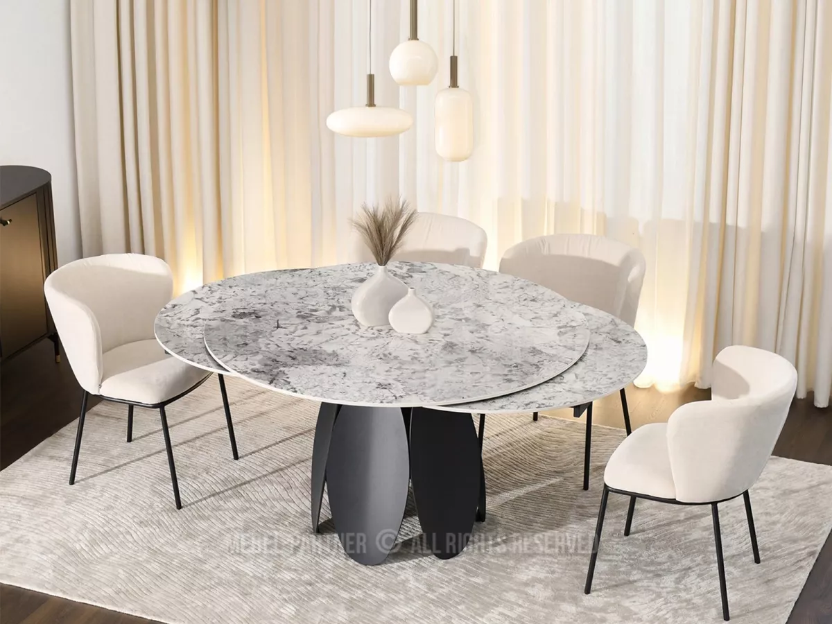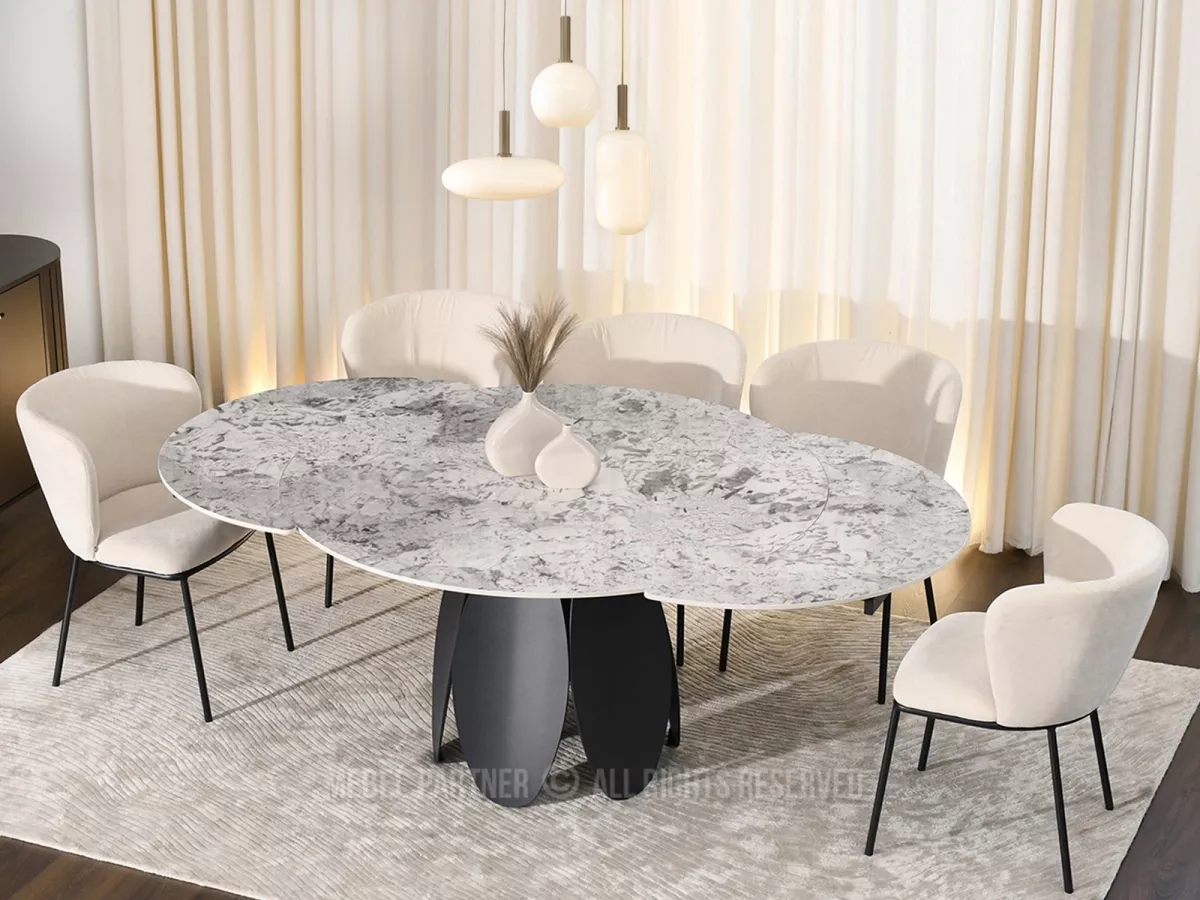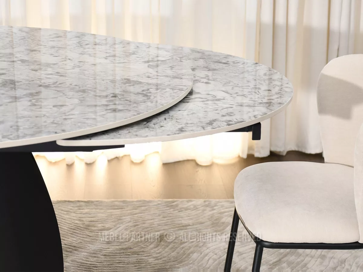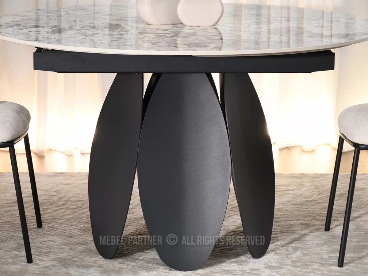 Designový jídelní stůl BAWER na první pohled zaujme především svou podstavou a dekorem mramoru. Stůl disponuje rozkládací funkcí na šířku 200 cm a je tak vhodný až pro 7 osob. Stůl je vyrobený z odolných materiálů, takže vám bude sloužit mnoho let.