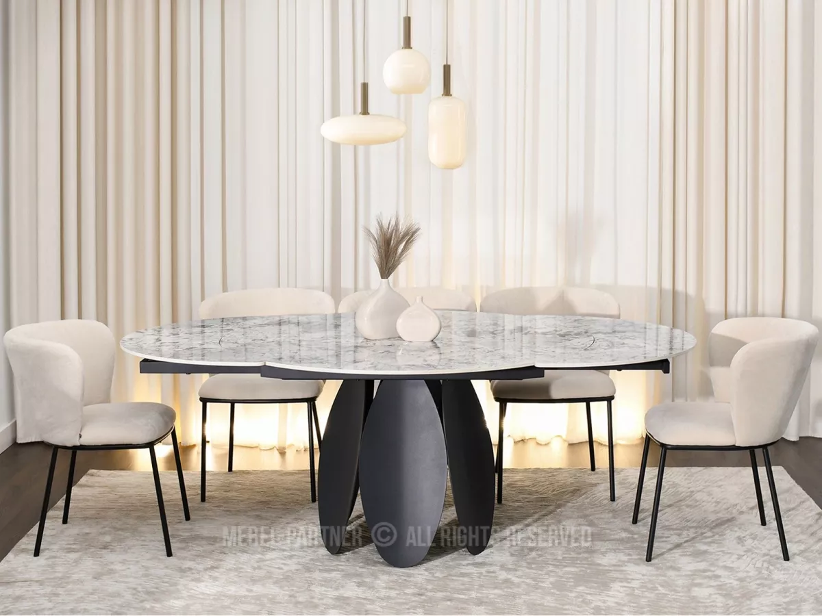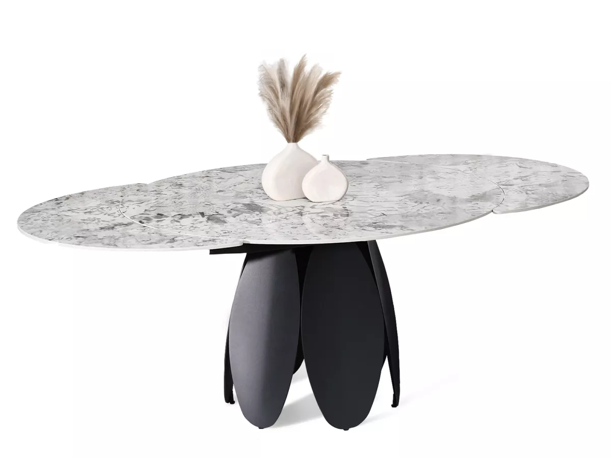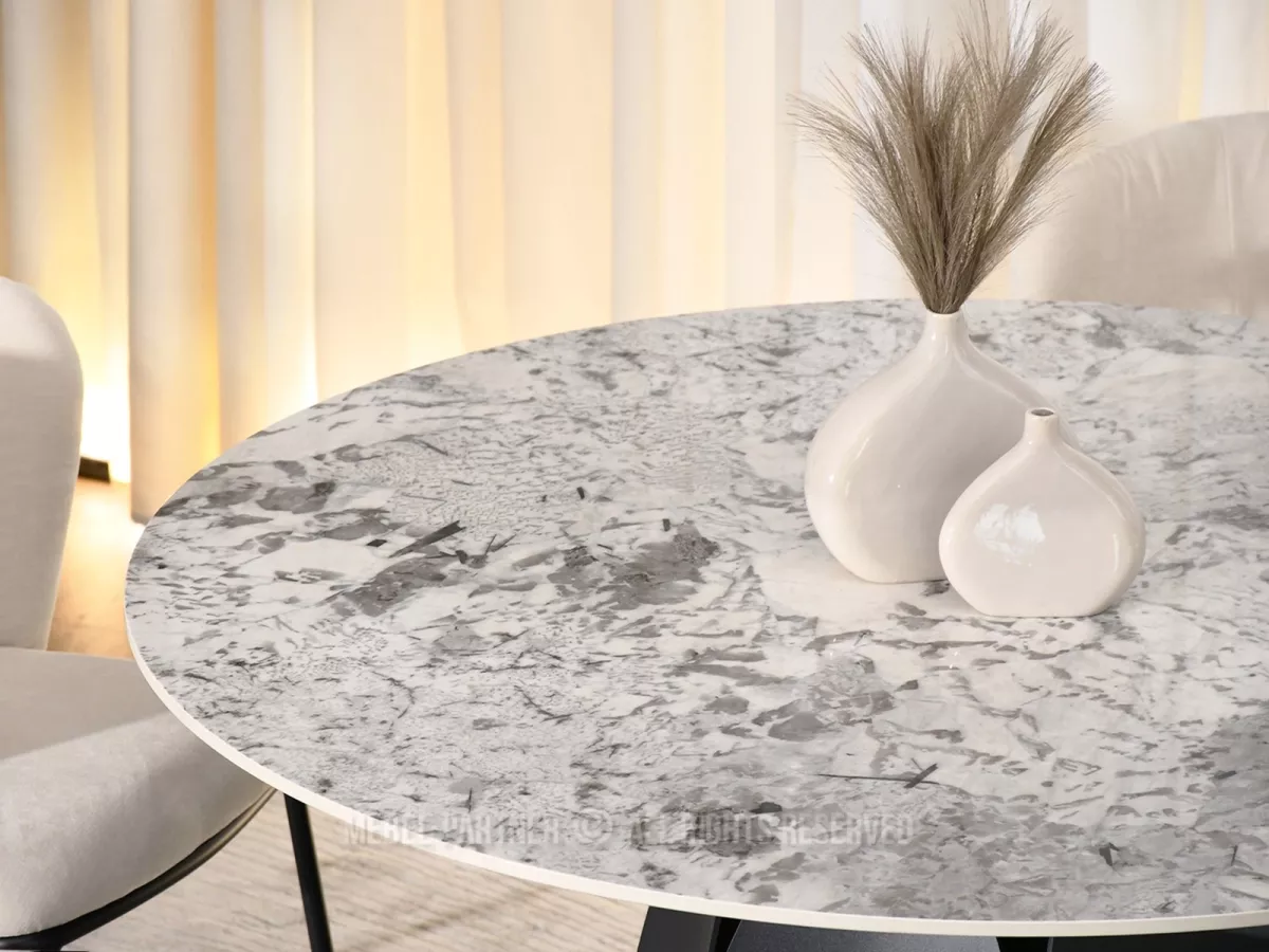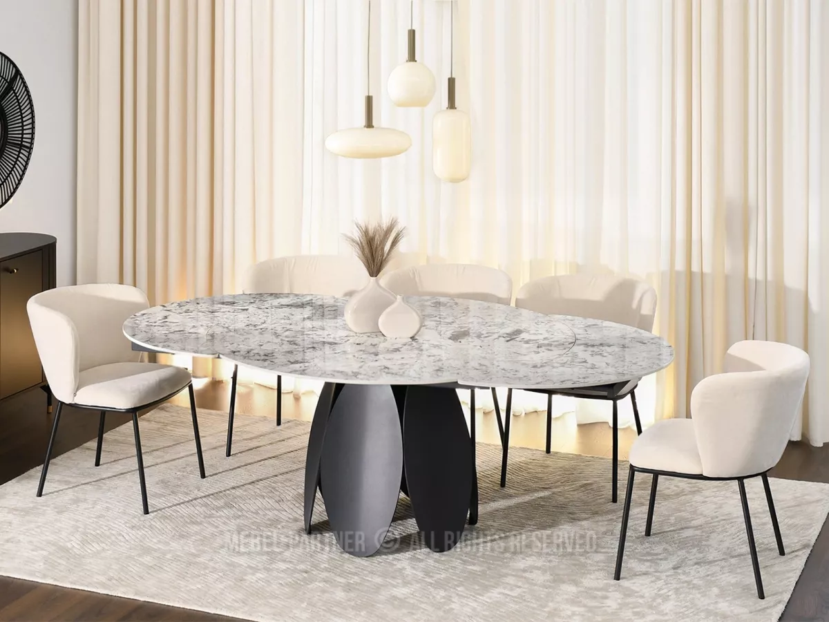 Designový jídelní stůl BAWER na první pohled zaujme především svou podstavou a dekorem mramoru. Stůl disponuje rozkládací funkcí na šířku 200 cm a je tak vhodný až pro 7 osob. Stůl je vyrobený z odolných materiálů, takže vám bude sloužit mnoho let.