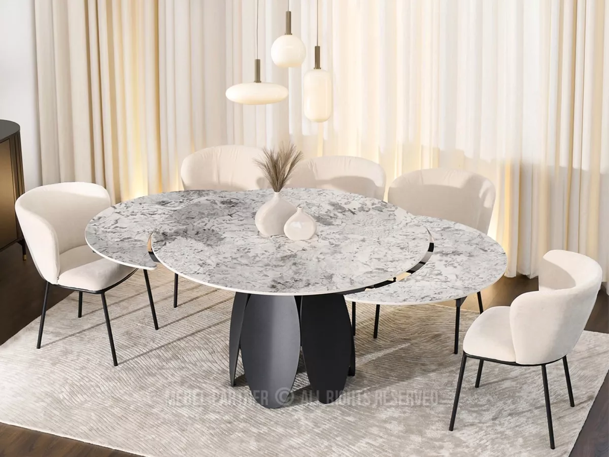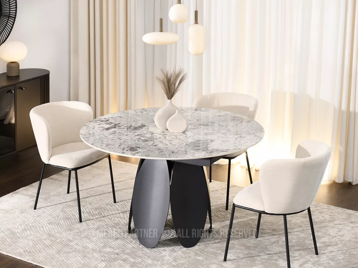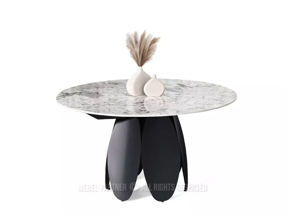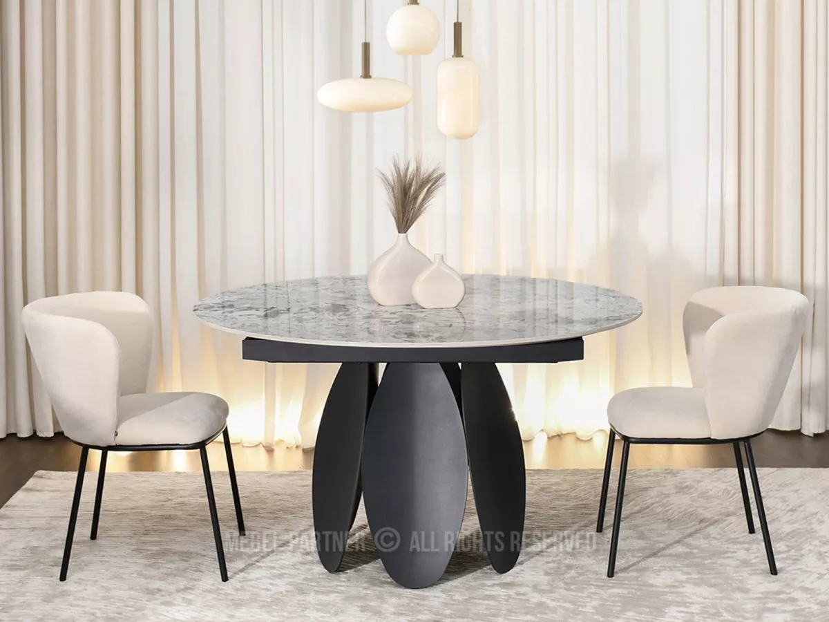 Designový jídelní stůl BAWER na první pohled zaujme především svou podstavou a dekorem mramoru. Stůl disponuje rozkládací funkcí na šířku 200 cm a je tak vhodný až pro 7 osob. Stůl je vyrobený z odolných materiálů, takže vám bude sloužit mnoho let.