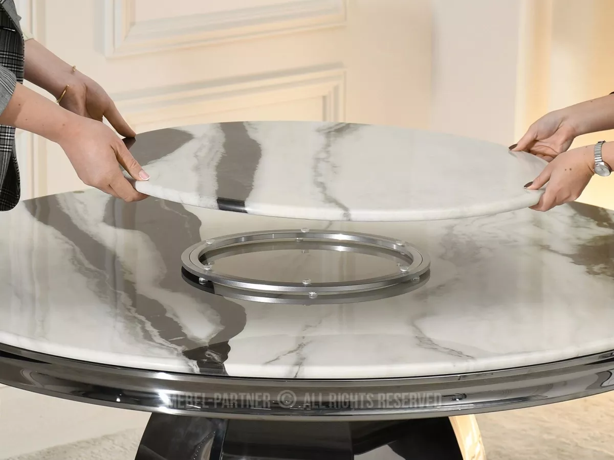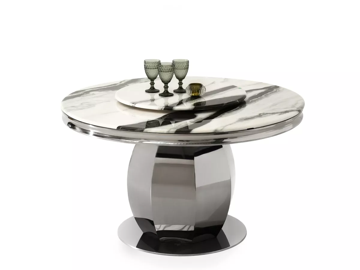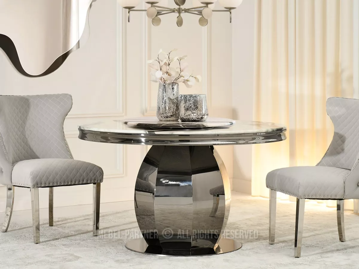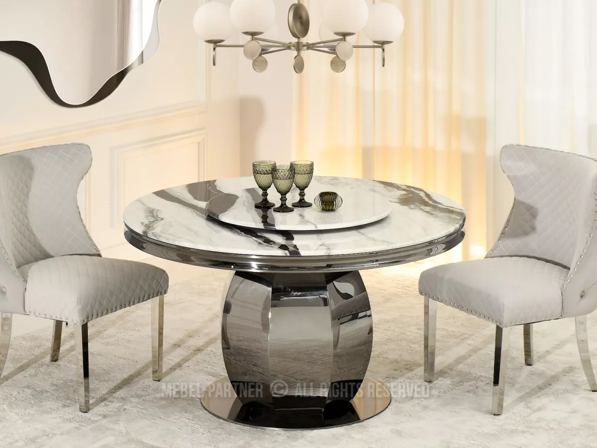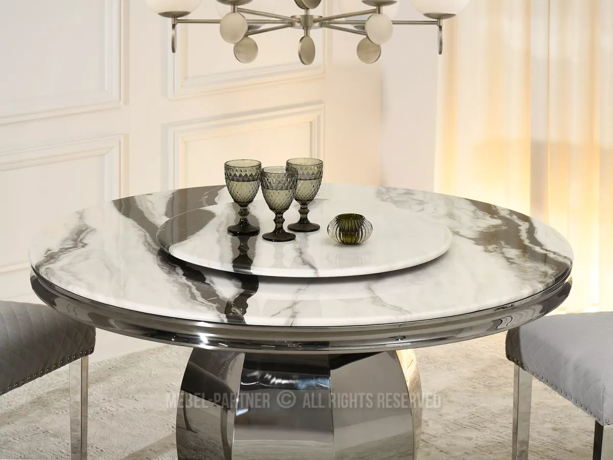 Kulatý jídelní stůl GEMMO skvěle kombinuje nadčasovou eleganci s funkčností. Stůl disponuje otočným tácem, který v případě potřeby můžete odebrat. Svou lesklou podstavou vnese do každé jídelny nebo kuchyně nádech elegance a luxusu.