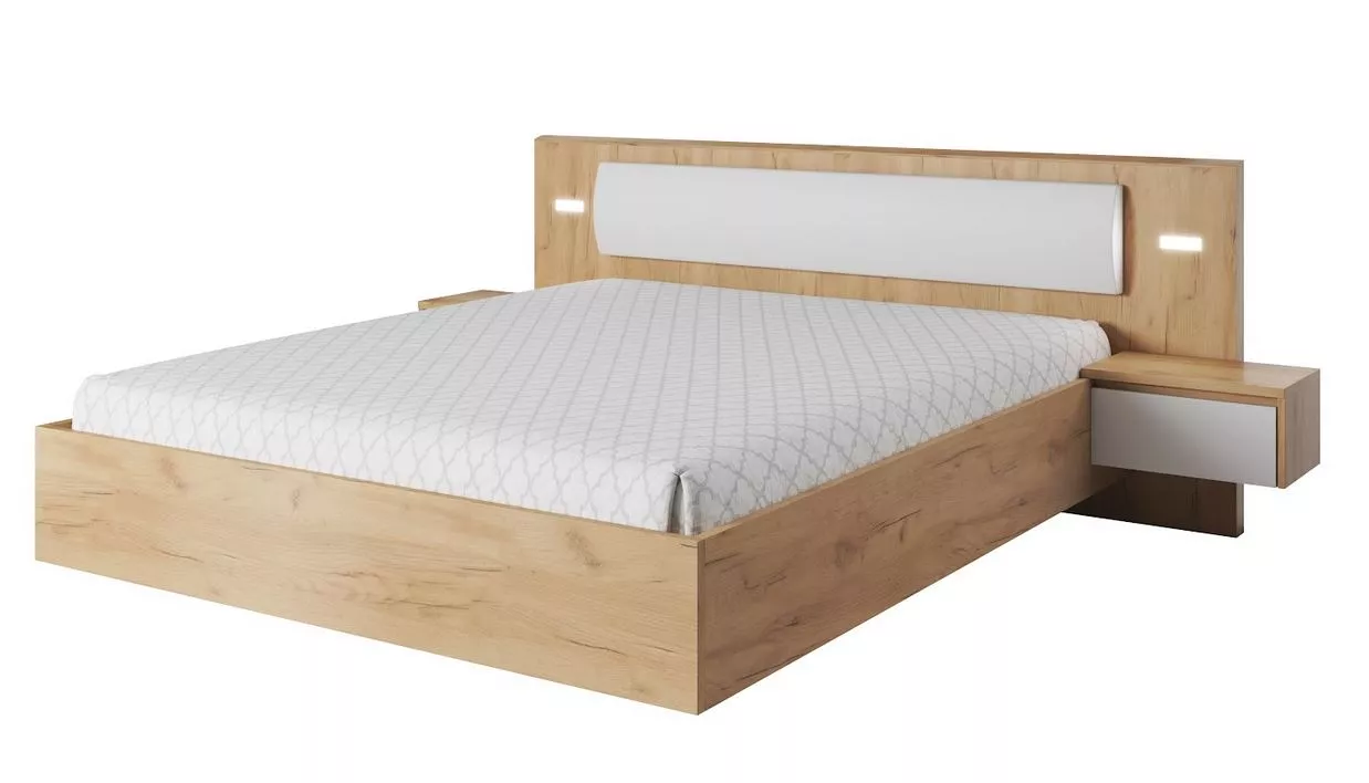 Sestava HELFIN 1 v bílé barvě v kombinaci s přírodním dubem vytvoří v ložnici klidnou a magickou atmosféru. Skládá se z manželské postele s nočními stolky a LED osvětlením, dále z velké šatní skříně a šuplíkové komody.