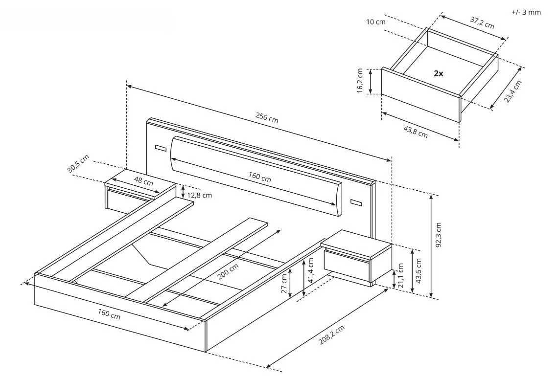 - manželská postel s nočními stolky: 256/92,3/208,2 cm; ložná plocha: 160x200 cm