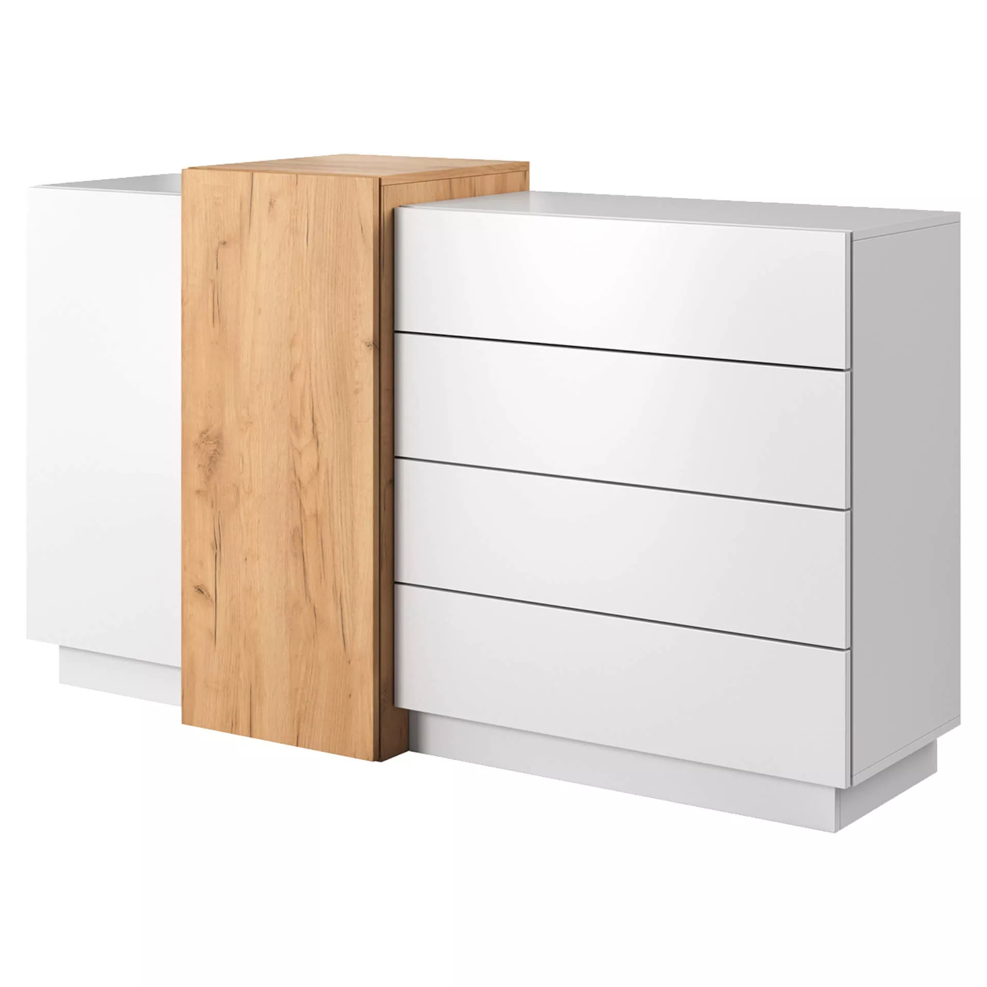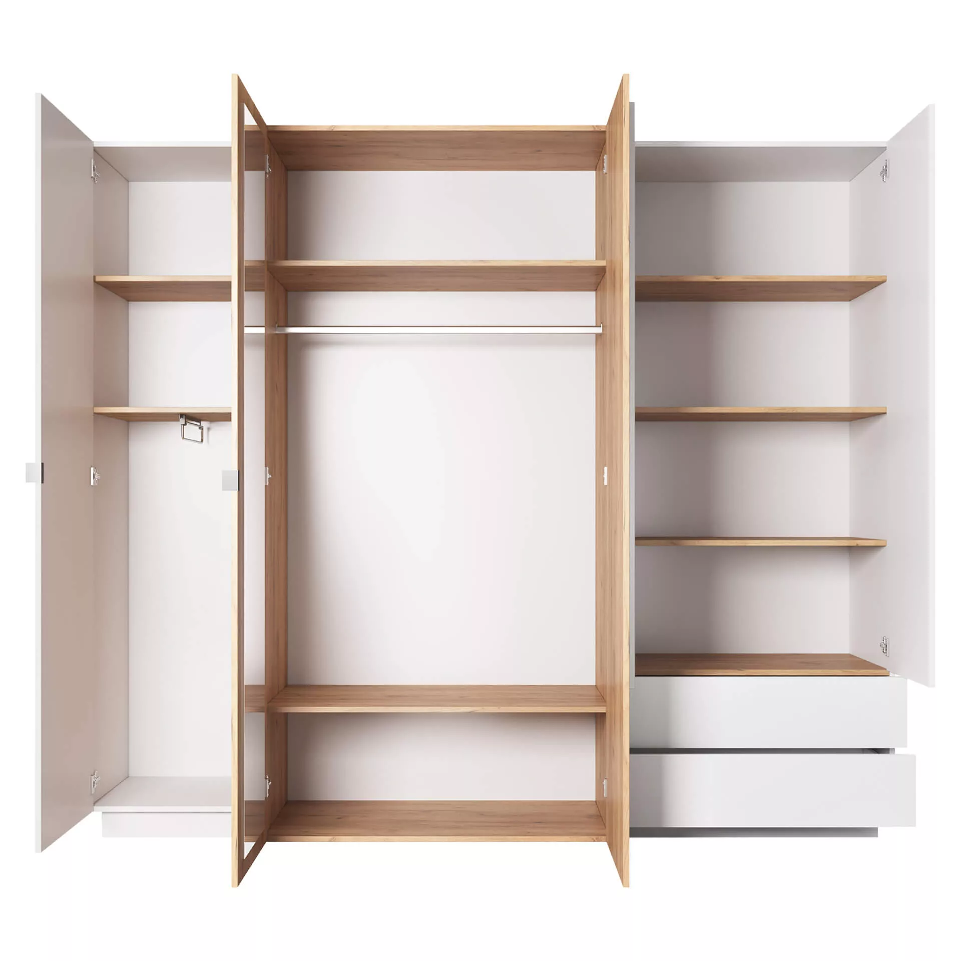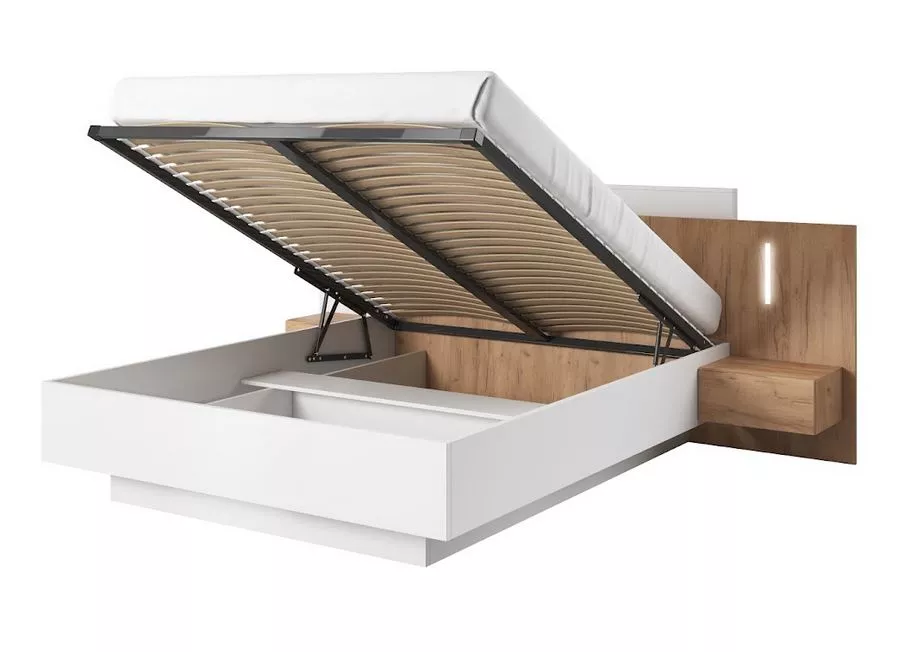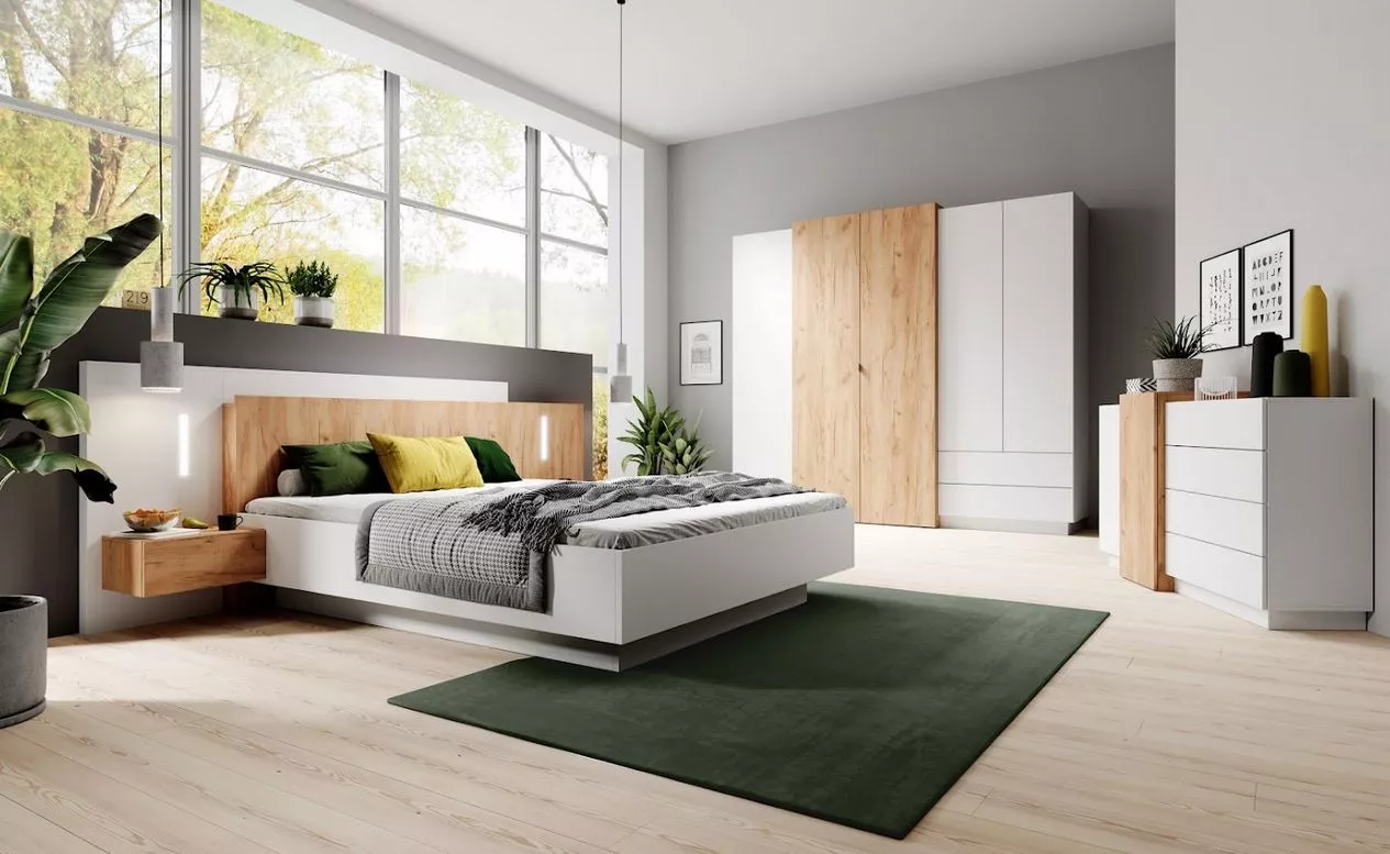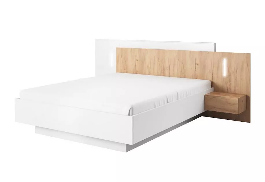 Sestava do ložnice SYLVANIA 1 zaujme kombinací přírodního dekoru zlatého dubu a bílé barvy, která dodává interiéru svěží a jedinečný charakter. Skládá se z manželské postele o spací ploše 160x200 cm s úložným prostorem. Součástí jsou také 2 noční stolky, které jsou vybavené bílým LED osvětlením. Dále sestava zahrnuje velkou šatní skříň a kombinovanou komodu.