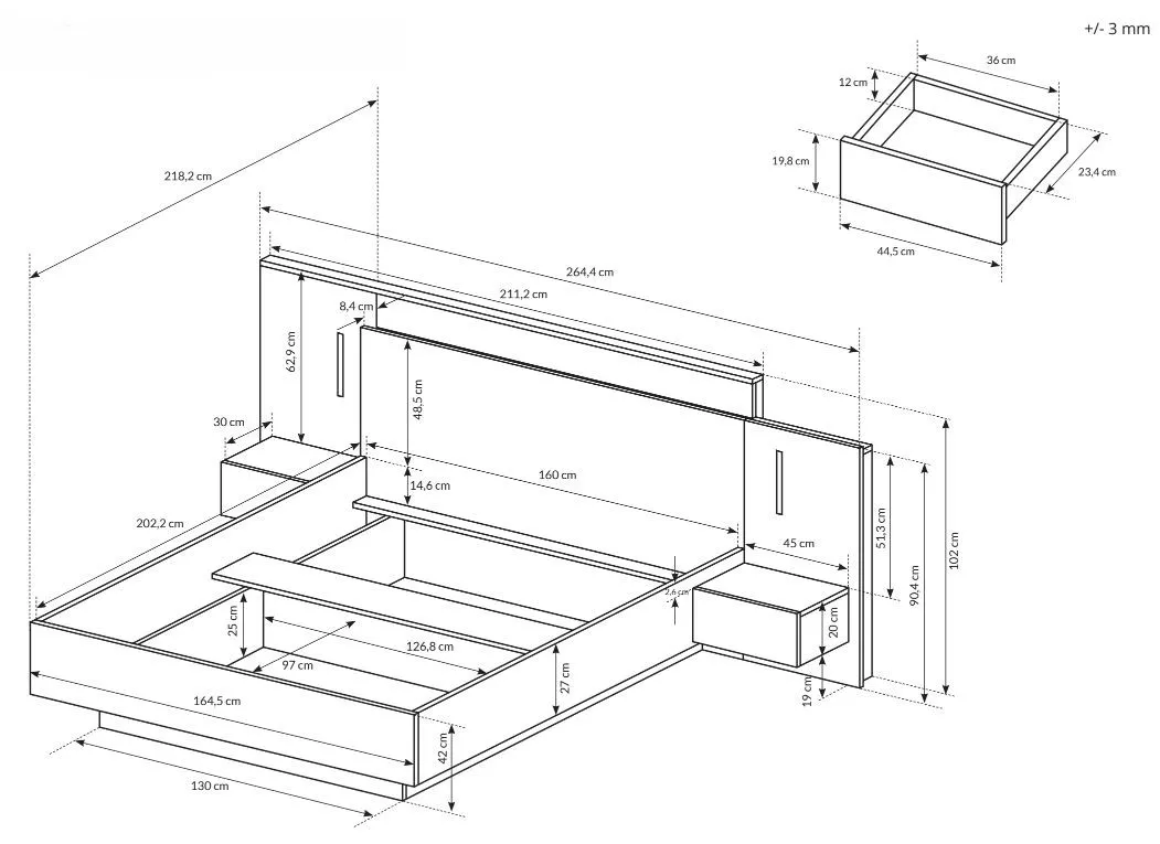 - manželská postel s nočními stolky: 264,4/102/218,2 cm