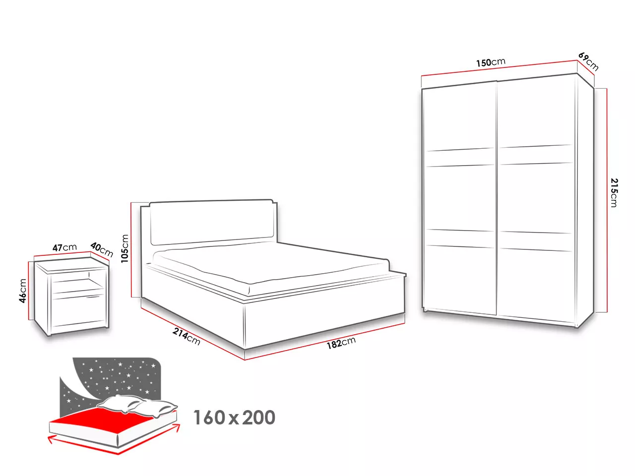 Nábytek do ložnice PEORIA 1 se vyznačuje univerzálními tlumenými barvami, díky nimž ve vaší ložnici zavládne harmonie. Sestava se skládá z manželské postele s čalouněným a pohodlným opěradlem. Postel disponuje úložným prostorem na ložní prádlo. Dalším prvkem je posuvná šatní skříň s řadou polic a tyčí na zavěšení oblečení. Sada navíc obsahuje 2 noční stolky.