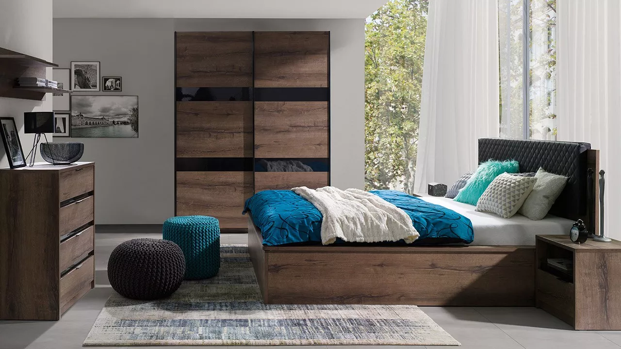 Nábytek do ložnice PEORIA 8 se vyznačuje univerzálními tlumenými barvami, díky nimž ve vaší ložnici zavládne harmonie. Sestava se skládá z manželské postele s čalouněným a pohodlným opěradlem. Postel disponuje úložným prostorem na ložní prádlo. Dalším prvkem je posuvná šatní skříň s řadou polic a tyčí na zavěšení oblečení. Skříň je vybavena systémem tichého dovírání. V prostorných zásuvkách komody můžete snadno ukládat jakékoliv předměty, včetně sezónního oblečení či spodního prádla. Sada navíc obsahuje dva noční stolky a závěsnou polici.