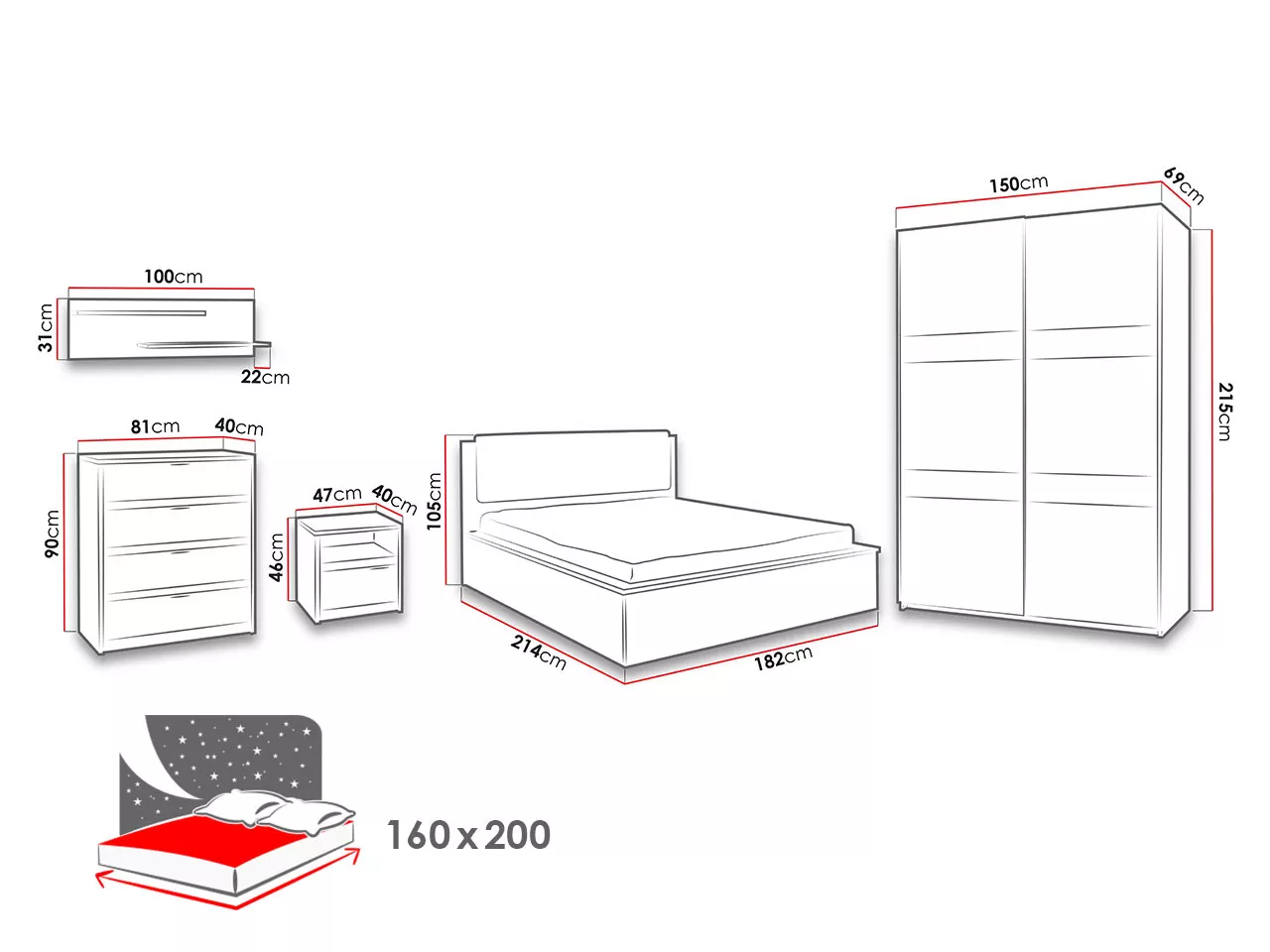 - postel: 182x105x214 cm