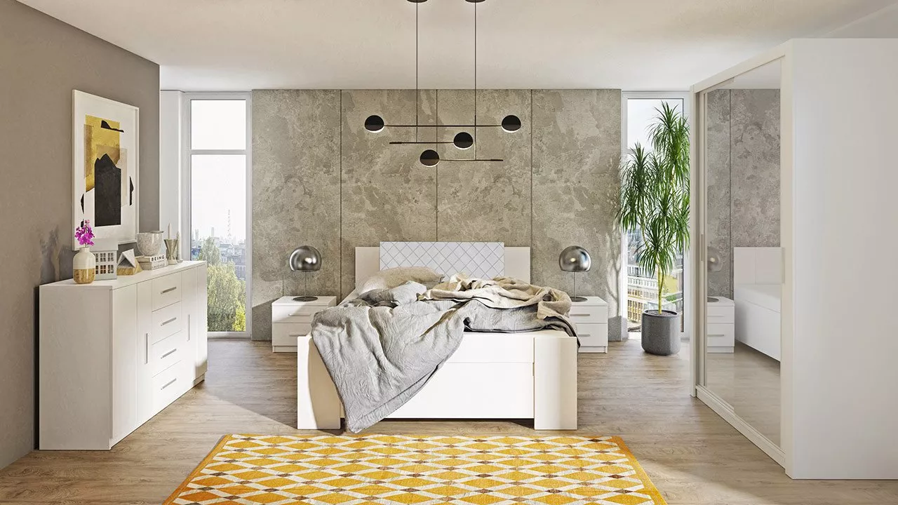 Nábytek do ložnice CORTLAND 1 je funkční sestava vytvořená pro stylové a praktické ložnice a obytné místnosti. Je zachována v jednoduchém a moderním designu a univerzálních barvách. Ložnice je vyrobena z pevných materiálů, které zajistí, že nábytek bude dlouhá léta vypadat jako nový. Prvním prvkem sestavy je kombinovaná komoda, která je vybavena skříńkami s policemi a řadou prostorných zásuvek. Šatní skříň s posuvnými dveřmi disponuje hlubokými policemi a samostatnou věšákovou zónou vybavenou šatními tyčemi na ramínka. Zrcadlo je praktickým doplňkem, abyste si mohli zkontrolovat svůj outfit. Dalším prvkem jsou dva noční stolky, které jsou vybavené praktickými zásuvkami pro úschovu různých doplňků. Posledním a nezbytným prvkem sestavy je manželská postel o spací ploše 160 x 200 cm. Optimální výška postele 90 cm usnadňuje vstávání z postele a zajišťuje dostatečné větrání matrace. Díky vysoké čalouněné opěrce hlavy získáte měkké a pohodlné opěradlo při večerním odpočinku s knihou. Postel je vybavena úložným prostorem pro lůžkoviny nebo sezónní oblečení.