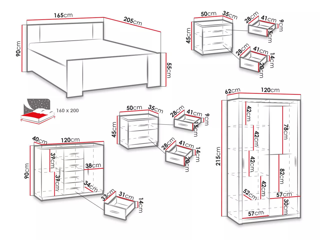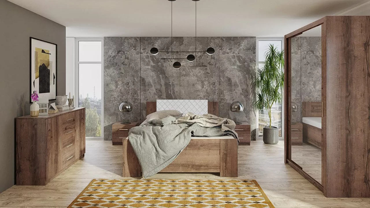 Nábytek do ložnice CORTLAND 1 je funkční sestava vytvořená pro stylové a praktické ložnice a obytné místnosti. Je zachována v jednoduchém a moderním designu a univerzálních barvách. Ložnice je vyrobena z pevných materiálů, které zajistí, že nábytek bude dlouhá léta vypadat jako nový. Prvním prvkem sestavy je kombinovaná komoda, která je vybavena skříńkami s policemi a řadou prostorných zásuvek. Šatní skříň s posuvnými dveřmi disponuje hlubokými policemi a samostatnou věšákovou zónou vybavenou šatními tyčemi na ramínka. Zrcadlo je praktickým doplňkem, abyste si mohli zkontrolovat svůj outfit. Dalším prvkem jsou dva noční stolky, které jsou vybavené praktickými zásuvkami pro úschovu různých doplňků. Posledním a nezbytným prvkem sestavy je manželská postel o spací ploše 160 x 200 cm. Optimální výška postele 90 cm usnadňuje vstávání z postele a zajišťuje dostatečné větrání matrace. Díky vysoké čalouněné opěrce hlavy získáte měkké a pohodlné opěradlo při večerním odpočinku s knihou. Postel je vybavena úložným prostorem pro lůžkoviny nebo sezónní oblečení.