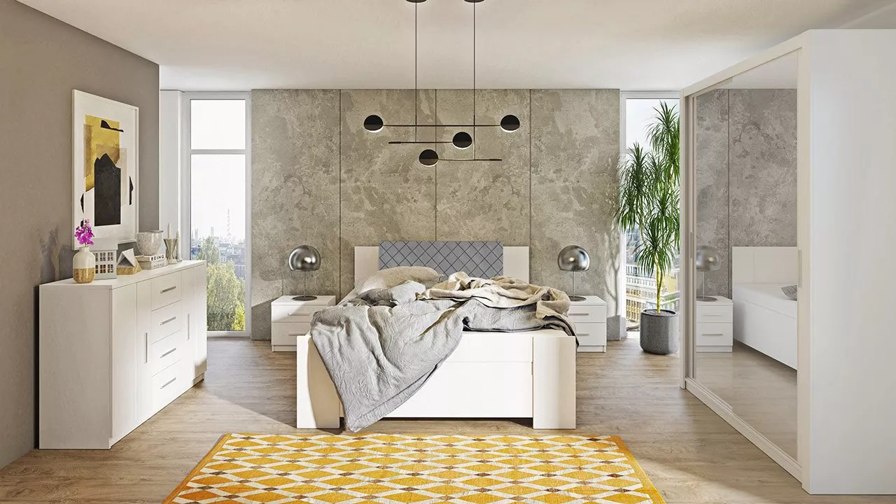 Nábytek do ložnice CORTLAND 2 je funkční sestava vytvořená pro stylové a praktické ložnice a obytné místnosti. Je zachována v jednoduchém a moderním designu a univerzálních barvách. Ložnice je vyrobena z pevných materiálů, které zajistí, že nábytek bude dlouhá léta vypadat jako nový. Prvním prvkem sestavy je kombinovaná komoda, která je vybavena skříńkami s policemi a řadou prostorných zásuvek. Šatní skříň s posuvnými dveřmi disponuje hlubokými policemi a samostatnou věšákovou zónou vybavenou šatními tyčemi na ramínka. Zrcadlo je praktickým doplňkem, abyste si mohli zkontrolovat svůj outfit. Dalším prvkem jsou dva noční stolky, které jsou vybavené praktickými zásuvkami pro úschovu různých doplňků. Posledním a nezbytným prvkem sestavy je manželská postel o spací ploše 160 x 200 cm. Optimální výška postele 90 cm usnadňuje vstávání z postele a zajišťuje dostatečné větrání matrace. Díky vysoké čalouněné opěrce hlavy získáte měkké a pohodlné opěradlo při večerním odpočinku s knihou. Postel je vybavena úložným prostorem pro lůžkoviny nebo sezónní oblečení.