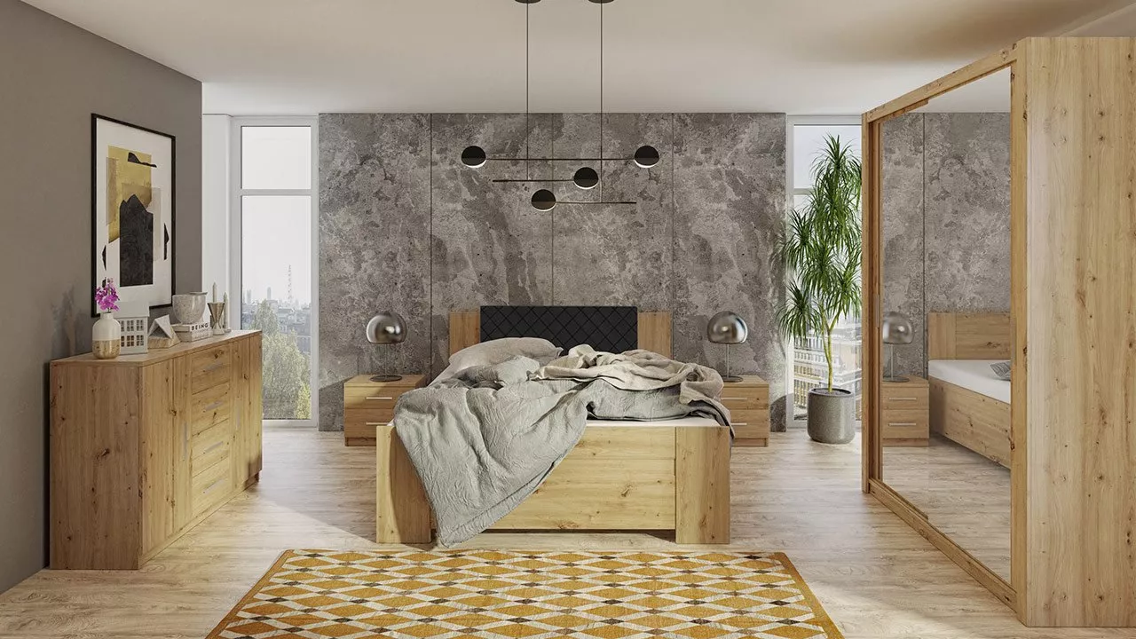 Nábytek do ložnice CORTLAND 2 je funkční sestava vytvořená pro stylové a praktické ložnice a obytné místnosti. Je zachována v jednoduchém a moderním designu a univerzálních barvách. Ložnice je vyrobena z pevných materiálů, které zajistí, že nábytek bude dlouhá léta vypadat jako nový. Prvním prvkem sestavy je kombinovaná komoda, která je vybavena skříńkami s policemi a řadou prostorných zásuvek. Šatní skříň s posuvnými dveřmi disponuje hlubokými policemi a samostatnou věšákovou zónou vybavenou šatními tyčemi na ramínka. Zrcadlo je praktickým doplňkem, abyste si mohli zkontrolovat svůj outfit. Dalším prvkem jsou dva noční stolky, které jsou vybavené praktickými zásuvkami pro úschovu různých doplňků. Posledním a nezbytným prvkem sestavy je manželská postel o spací ploše 160 x 200 cm. Optimální výška postele 90 cm usnadňuje vstávání z postele a zajišťuje dostatečné větrání matrace. Díky vysoké čalouněné opěrce hlavy získáte měkké a pohodlné opěradlo při večerním odpočinku s knihou. Postel je vybavena úložným prostorem pro lůžkoviny nebo sezónní oblečení.