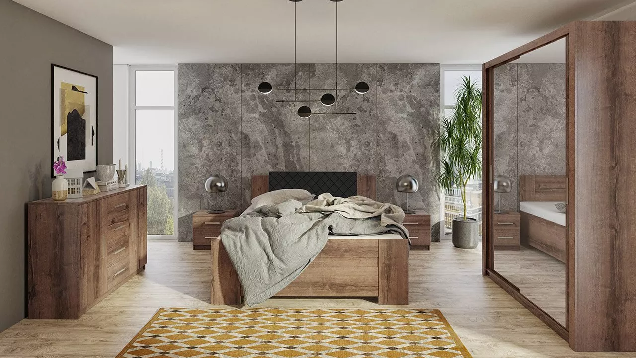 Nábytek do ložnice CORTLAND 2 je funkční sestava vytvořená pro stylové a praktické ložnice a obytné místnosti. Je zachována v jednoduchém a moderním designu a univerzálních barvách. Ložnice je vyrobena z pevných materiálů, které zajistí, že nábytek bude dlouhá léta vypadat jako nový. Prvním prvkem sestavy je kombinovaná komoda, která je vybavena skříńkami s policemi a řadou prostorných zásuvek. Šatní skříň s posuvnými dveřmi disponuje hlubokými policemi a samostatnou věšákovou zónou vybavenou šatními tyčemi na ramínka. Zrcadlo je praktickým doplňkem, abyste si mohli zkontrolovat svůj outfit. Dalším prvkem jsou dva noční stolky, které jsou vybavené praktickými zásuvkami pro úschovu různých doplňků. Posledním a nezbytným prvkem sestavy je manželská postel o spací ploše 160 x 200 cm. Optimální výška postele 90 cm usnadňuje vstávání z postele a zajišťuje dostatečné větrání matrace. Díky vysoké čalouněné opěrce hlavy získáte měkké a pohodlné opěradlo při večerním odpočinku s knihou. Postel je vybavena úložným prostorem pro lůžkoviny nebo sezónní oblečení.