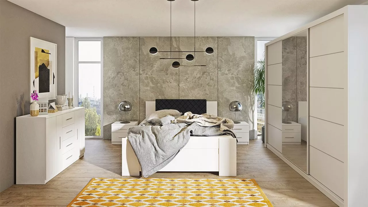 Nábytek do ložnice CORTLAND 3 je funkční sestava vytvořená pro stylové a praktické ložnice a obytné místnosti. Je zachována v jednoduchém a moderním designu a univerzálních barvách. Ložnice je vyrobena z pevných materiálů, které zajistí, že nábytek bude dlouhá léta vypadat jako nový. Prvním prvkem sestavy je kombinovaná komoda, která je vybavena skříńkami s policemi a řadou prostorných zásuvek. Šatní skříň s posuvnými dveřmi disponuje hlubokými policemi a samostatnou věšákovou zónou vybavenou šatními tyčemi na ramínka. Zrcadlo je praktickým doplňkem, abyste si mohli zkontrolovat svůj outfit. Dalším prvkem jsou dva noční stolky, které jsou vybavené praktickými zásuvkami pro úschovu různých doplňků. Posledním a nezbytným prvkem sestavy je manželská postel o spací ploše 160 x 200 cm. Optimální výška postele 90 cm usnadňuje vstávání z postele a zajišťuje dostatečné větrání matrace. Díky vysoké čalouněné opěrce hlavy získáte měkké a pohodlné opěradlo při večerním odpočinku s knihou. Postel je vybavena úložným prostorem pro lůžkoviny nebo sezónní oblečení.