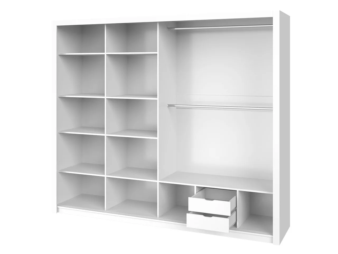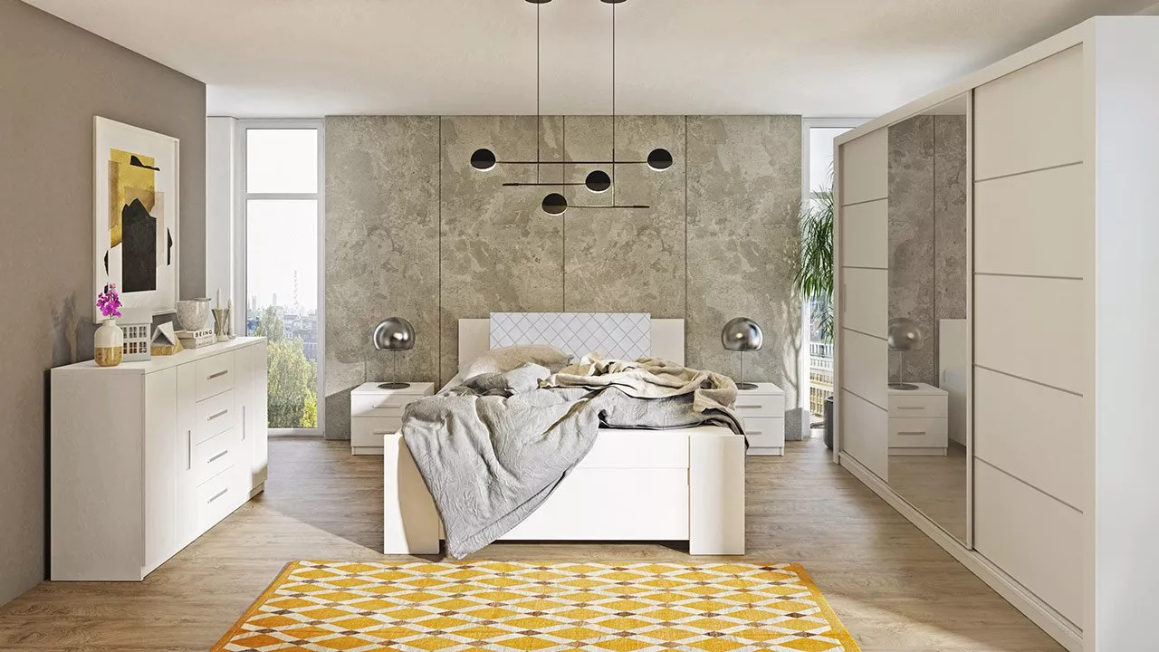 Nábytek do ložnice CORTLAND 3 je funkční sestava vytvořená pro stylové a praktické ložnice a obytné místnosti. Je zachována v jednoduchém a moderním designu a univerzálních barvách. Ložnice je vyrobena z pevných materiálů, které zajistí, že nábytek bude dlouhá léta vypadat jako nový. Prvním prvkem sestavy je kombinovaná komoda, která je vybavena skříńkami s policemi a řadou prostorných zásuvek. Šatní skříň s posuvnými dveřmi disponuje hlubokými policemi a samostatnou věšákovou zónou vybavenou šatními tyčemi na ramínka. Zrcadlo je praktickým doplňkem, abyste si mohli zkontrolovat svůj outfit. Dalším prvkem jsou dva noční stolky, které jsou vybavené praktickými zásuvkami pro úschovu různých doplňků. Posledním a nezbytným prvkem sestavy je manželská postel o spací ploše 160 x 200 cm. Optimální výška postele 90 cm usnadňuje vstávání z postele a zajišťuje dostatečné větrání matrace. Díky vysoké čalouněné opěrce hlavy získáte měkké a pohodlné opěradlo při večerním odpočinku s knihou. Postel je vybavena úložným prostorem pro lůžkoviny nebo sezónní oblečení.