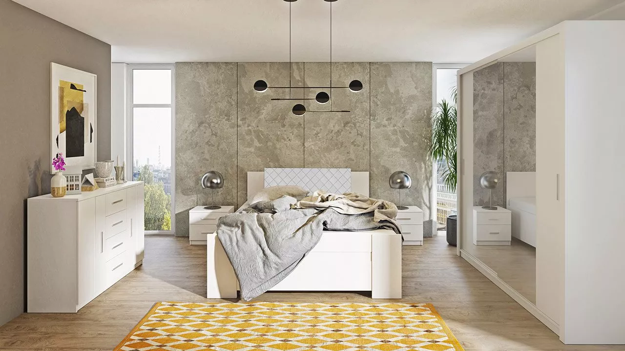 Nábytek do ložnice CORTLAND 4 je funkční sestava vytvořená pro stylové a praktické ložnice a obytné místnosti. Je zachována v jednoduchém a moderním designu a univerzálních barvách. Ložnice je vyrobena z pevných materiálů, které zajistí, že nábytek bude dlouhá léta vypadat jako nový. Prvním prvkem sestavy je kombinovaná komoda, která je vybavena skříńkami s policemi a řadou prostorných zásuvek. Šatní skříň s posuvnými dveřmi disponuje hlubokými policemi a samostatnou věšákovou zónou vybavenou šatními tyčemi na ramínka. Zrcadlo je praktickým doplňkem, abyste si mohli zkontrolovat svůj outfit. Dalším prvkem jsou dva noční stolky, které jsou vybavené praktickými zásuvkami pro úschovu různých doplňků. Posledním a nezbytným prvkem sestavy je manželská postel o spací ploše 160 x 200 cm. Optimální výška postele 90 cm usnadňuje vstávání z postele a zajišťuje dostatečné větrání matrace. Díky vysoké čalouněné opěrce hlavy získáte měkké a pohodlné opěradlo při večerním odpočinku s knihou. Postel je vybavena úložným prostorem pro lůžkoviny nebo sezónní oblečení.