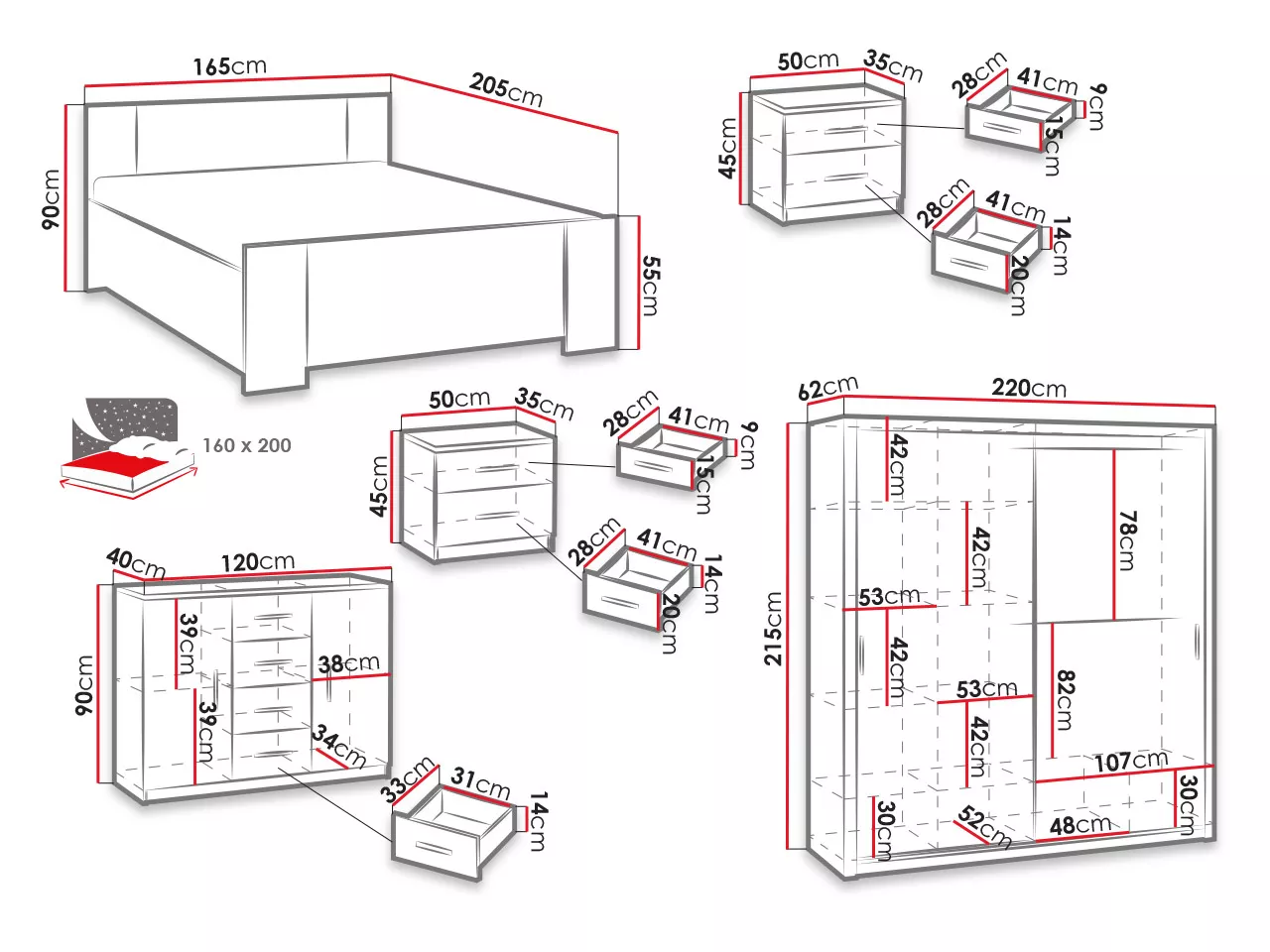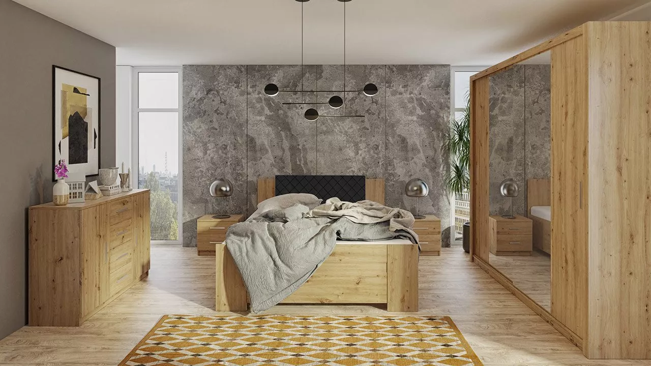 Nábytek do ložnice CORTLAND 5 je funkční sestava vytvořená pro stylové a praktické ložnice a obytné místnosti. Je zachována v jednoduchém a moderním designu a univerzálních barvách. Ložnice je vyrobena z pevných materiálů, které zajistí, že nábytek bude dlouhá léta vypadat jako nový. Prvním prvkem sestavy je kombinovaná komoda, která je vybavena skříńkami s policemi a řadou prostorných zásuvek. Šatní skříň s posuvnými dveřmi disponuje hlubokými policemi a samostatnou věšákovou zónou vybavenou šatními tyčemi na ramínka. Zrcadlo je praktickým doplňkem, abyste si mohli zkontrolovat svůj outfit. Dalším prvkem jsou dva noční stolky, které jsou vybavené praktickými zásuvkami pro úschovu různých doplňků. Posledním a nezbytným prvkem sestavy je manželská postel o spací ploše 160 x 200 cm. Optimální výška postele 90 cm usnadňuje vstávání z postele a zajišťuje dostatečné větrání matrace. Díky vysoké čalouněné opěrce hlavy získáte měkké a pohodlné opěradlo při večerním odpočinku s knihou. Postel je vybavena úložným prostorem pro lůžkoviny nebo sezónní oblečení.