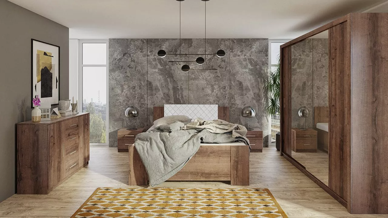 Nábytek do ložnice CORTLAND 5 je funkční sestava vytvořená pro stylové a praktické ložnice a obytné místnosti. Je zachována v jednoduchém a moderním designu a univerzálních barvách. Ložnice je vyrobena z pevných materiálů, které zajistí, že nábytek bude dlouhá léta vypadat jako nový. Prvním prvkem sestavy je kombinovaná komoda, která je vybavena skříńkami s policemi a řadou prostorných zásuvek. Šatní skříň s posuvnými dveřmi disponuje hlubokými policemi a samostatnou věšákovou zónou vybavenou šatními tyčemi na ramínka. Zrcadlo je praktickým doplňkem, abyste si mohli zkontrolovat svůj outfit. Dalším prvkem jsou dva noční stolky, které jsou vybavené praktickými zásuvkami pro úschovu různých doplňků. Posledním a nezbytným prvkem sestavy je manželská postel o spací ploše 160 x 200 cm. Optimální výška postele 90 cm usnadňuje vstávání z postele a zajišťuje dostatečné větrání matrace. Díky vysoké čalouněné opěrce hlavy získáte měkké a pohodlné opěradlo při večerním odpočinku s knihou. Postel je vybavena úložným prostorem pro lůžkoviny nebo sezónní oblečení.
