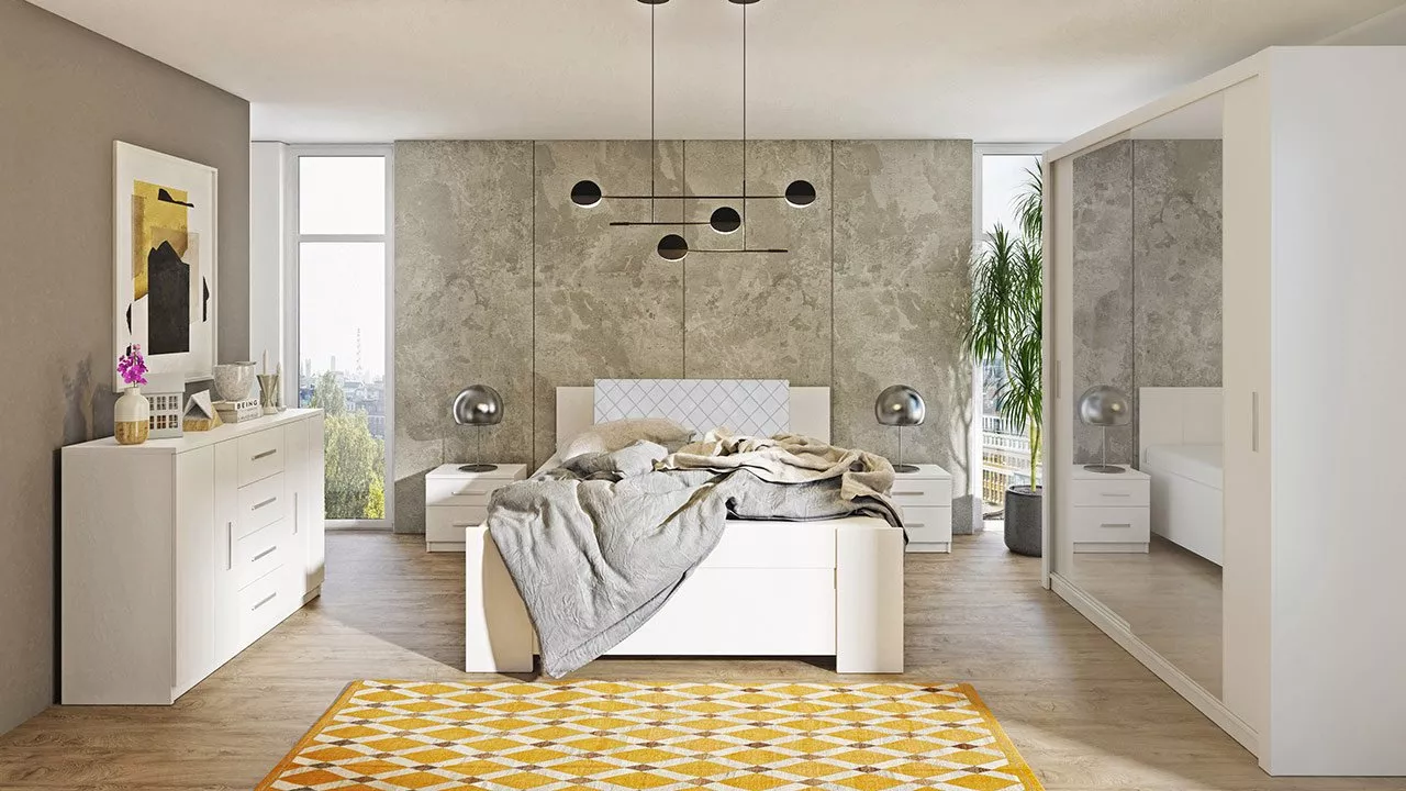 Nábytek do ložnice CORTLAND 6 je funkční sestava vytvořená pro stylové a praktické ložnice a obytné místnosti. Je zachována v jednoduchém a moderním designu a univerzálních barvách. Ložnice je vyrobena z pevných materiálů, které zajistí, že nábytek bude dlouhá léta vypadat jako nový. Prvním prvkem sestavy je kombinovaná komoda, která je vybavena skříńkami s policemi a řadou prostorných zásuvek. Šatní skříň s posuvnými dveřmi disponuje hlubokými policemi a samostatnou věšákovou zónou vybavenou šatními tyčemi na ramínka. Zrcadlo je praktickým doplňkem, abyste si mohli zkontrolovat svůj outfit. Dalším prvkem jsou dva noční stolky, které jsou vybavené praktickými zásuvkami pro úschovu různých doplňků. Posledním a nezbytným prvkem sestavy je manželská postel o spací ploše 160 x 200 cm. Optimální výška postele 90 cm usnadňuje vstávání z postele a zajišťuje dostatečné větrání matrace. Díky vysoké čalouněné opěrce hlavy získáte měkké a pohodlné opěradlo při večerním odpočinku s knihou. Postel je vybavena úložným prostorem pro lůžkoviny nebo sezónní oblečení.