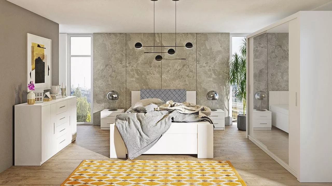 Nábytek do ložnice CORTLAND 6 je funkční sestava vytvořená pro stylové a praktické ložnice a obytné místnosti. Je zachována v jednoduchém a moderním designu a univerzálních barvách. Ložnice je vyrobena z pevných materiálů, které zajistí, že nábytek bude dlouhá léta vypadat jako nový. Prvním prvkem sestavy je kombinovaná komoda, která je vybavena skříńkami s policemi a řadou prostorných zásuvek. Šatní skříň s posuvnými dveřmi disponuje hlubokými policemi a samostatnou věšákovou zónou vybavenou šatními tyčemi na ramínka. Zrcadlo je praktickým doplňkem, abyste si mohli zkontrolovat svůj outfit. Dalším prvkem jsou dva noční stolky, které jsou vybavené praktickými zásuvkami pro úschovu různých doplňků. Posledním a nezbytným prvkem sestavy je manželská postel o spací ploše 160 x 200 cm. Optimální výška postele 90 cm usnadňuje vstávání z postele a zajišťuje dostatečné větrání matrace. Díky vysoké čalouněné opěrce hlavy získáte měkké a pohodlné opěradlo při večerním odpočinku s knihou. Postel je vybavena úložným prostorem pro lůžkoviny nebo sezónní oblečení.