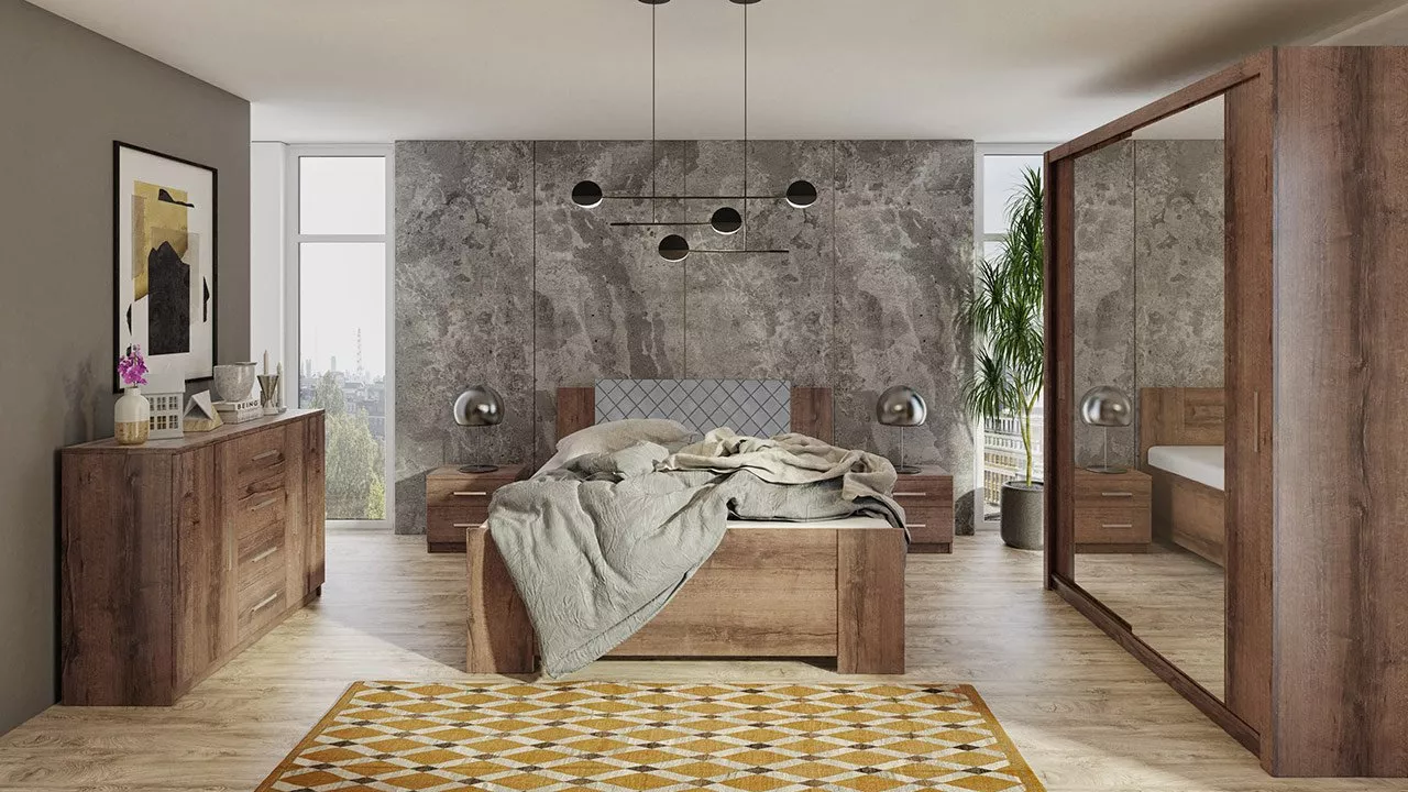 Nábytek do ložnice CORTLAND 6 je funkční sestava vytvořená pro stylové a praktické ložnice a obytné místnosti. Je zachována v jednoduchém a moderním designu a univerzálních barvách. Ložnice je vyrobena z pevných materiálů, které zajistí, že nábytek bude dlouhá léta vypadat jako nový. Prvním prvkem sestavy je kombinovaná komoda, která je vybavena skříńkami s policemi a řadou prostorných zásuvek. Šatní skříň s posuvnými dveřmi disponuje hlubokými policemi a samostatnou věšákovou zónou vybavenou šatními tyčemi na ramínka. Zrcadlo je praktickým doplňkem, abyste si mohli zkontrolovat svůj outfit. Dalším prvkem jsou dva noční stolky, které jsou vybavené praktickými zásuvkami pro úschovu různých doplňků. Posledním a nezbytným prvkem sestavy je manželská postel o spací ploše 160 x 200 cm. Optimální výška postele 90 cm usnadňuje vstávání z postele a zajišťuje dostatečné větrání matrace. Díky vysoké čalouněné opěrce hlavy získáte měkké a pohodlné opěradlo při večerním odpočinku s knihou. Postel je vybavena úložným prostorem pro lůžkoviny nebo sezónní oblečení.