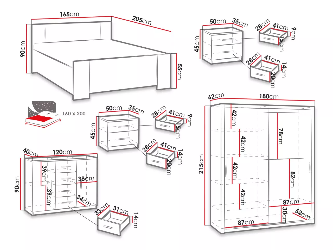 - postel: 165x90x205 cm