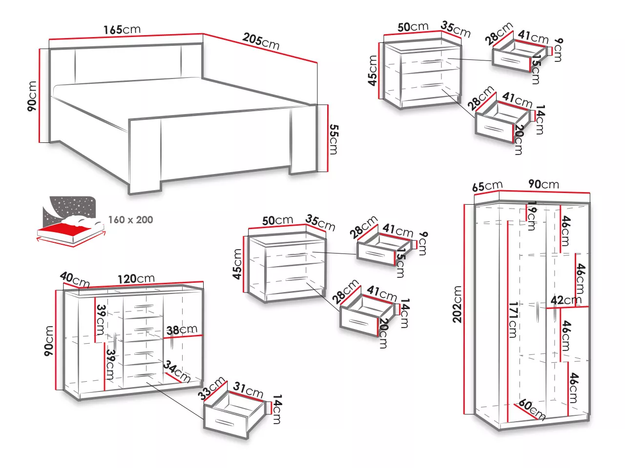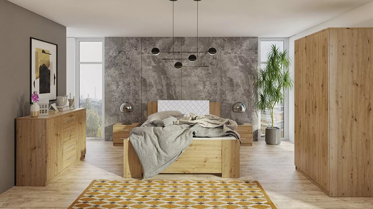 Nábytek do ložnice CORTLAND 7 je funkční sestava vytvořená pro stylové a praktické ložnice a obytné místnosti. Je zachována v jednoduchém a moderním designu a univerzálních barvách. Ložnice je vyrobena z pevných materiálů, které zajistí, že nábytek bude dlouhá léta vypadat jako nový. Prvním prvkem sestavy je kombinovaná komoda, která je vybavena skříńkami s policemi a řadou prostorných zásuvek. Dvoudveřová šatní skříň o šířce 90 cm disponuje hlubokými policemi a samostatnou věšákovou zónou vybavenou šatními tyčemi na ramínka. Dalším prvkem jsou dva noční stolky, které jsou vybavené praktickými zásuvkami pro úschovu různých doplňků. Posledním a nezbytným prvkem sestavy je manželská postel o spací ploše 160 x 200 cm. Optimální výška postele 90 cm usnadňuje vstávání z postele a zajišťuje dostatečné větrání matrace. Díky vysoké čalouněné opěrce hlavy získáte měkké a pohodlné opěradlo při večerním odpočinku s knihou. Postel je vybavena úložným prostorem pro lůžkoviny nebo sezónní oblečení.