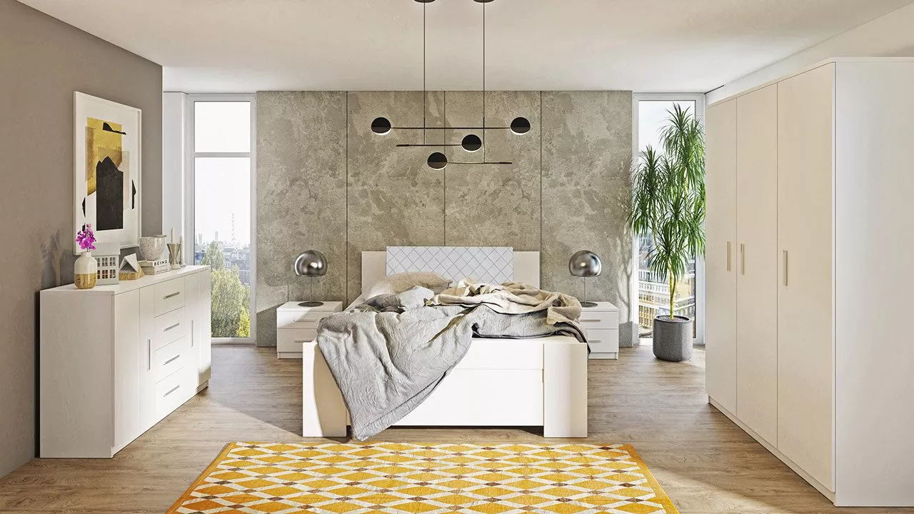 Nábytek do ložnice CORTLAND 8 je funkční sestava vytvořená pro stylové a praktické ložnice a obytné místnosti. Je zachována v jednoduchém a moderním designu a univerzálních barvách. Ložnice je vyrobena z pevných materiálů, které zajistí, že nábytek bude dlouhá léta vypadat jako nový. Prvním prvkem sestavy je kombinovaná komoda, která je vybavena skříńkami s policemi a řadou prostorných zásuvek. Šatní skříň o šířce 135 cm disponuje hlubokými policemi a samostatnou věšákovou zónou vybavenou šatními tyčemi na ramínka. Dalším prvkem jsou dva noční stolky, které jsou vybavené praktickými zásuvkami pro úschovu různých doplňků. Posledním a nezbytným prvkem sestavy je manželská postel o spací ploše 160 x 200 cm. Optimální výška postele 90 cm usnadňuje vstávání z postele a zajišťuje dostatečné větrání matrace. Díky vysoké čalouněné opěrce hlavy získáte měkké a pohodlné opěradlo při večerním odpočinku s knihou. Postel je vybavena úložným prostorem pro lůžkoviny nebo sezónní oblečení.