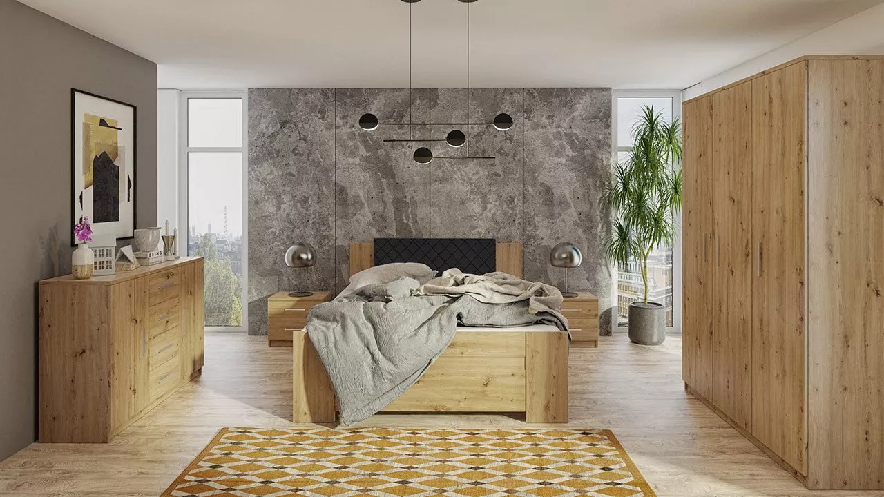 Nábytek do ložnice CORTLAND 8 je funkční sestava vytvořená pro stylové a praktické ložnice a obytné místnosti. Je zachována v jednoduchém a moderním designu a univerzálních barvách. Ložnice je vyrobena z pevných materiálů, které zajistí, že nábytek bude dlouhá léta vypadat jako nový. Prvním prvkem sestavy je kombinovaná komoda, která je vybavena skříńkami s policemi a řadou prostorných zásuvek. Šatní skříň o šířce 135 cm disponuje hlubokými policemi a samostatnou věšákovou zónou vybavenou šatními tyčemi na ramínka. Dalším prvkem jsou dva noční stolky, které jsou vybavené praktickými zásuvkami pro úschovu různých doplňků. Posledním a nezbytným prvkem sestavy je manželská postel o spací ploše 160 x 200 cm. Optimální výška postele 90 cm usnadňuje vstávání z postele a zajišťuje dostatečné větrání matrace. Díky vysoké čalouněné opěrce hlavy získáte měkké a pohodlné opěradlo při večerním odpočinku s knihou. Postel je vybavena úložným prostorem pro lůžkoviny nebo sezónní oblečení.