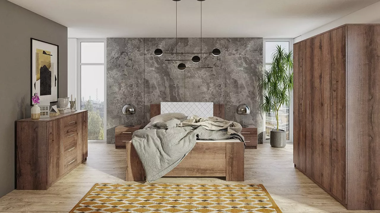 Nábytek do ložnice CORTLAND 8 je funkční sestava vytvořená pro stylové a praktické ložnice a obytné místnosti. Je zachována v jednoduchém a moderním designu a univerzálních barvách. Ložnice je vyrobena z pevných materiálů, které zajistí, že nábytek bude dlouhá léta vypadat jako nový. Prvním prvkem sestavy je kombinovaná komoda, která je vybavena skříńkami s policemi a řadou prostorných zásuvek. Šatní skříň o šířce 135 cm disponuje hlubokými policemi a samostatnou věšákovou zónou vybavenou šatními tyčemi na ramínka. Dalším prvkem jsou dva noční stolky, které jsou vybavené praktickými zásuvkami pro úschovu různých doplňků. Posledním a nezbytným prvkem sestavy je manželská postel o spací ploše 160 x 200 cm. Optimální výška postele 90 cm usnadňuje vstávání z postele a zajišťuje dostatečné větrání matrace. Díky vysoké čalouněné opěrce hlavy získáte měkké a pohodlné opěradlo při večerním odpočinku s knihou. Postel je vybavena úložným prostorem pro lůžkoviny nebo sezónní oblečení.