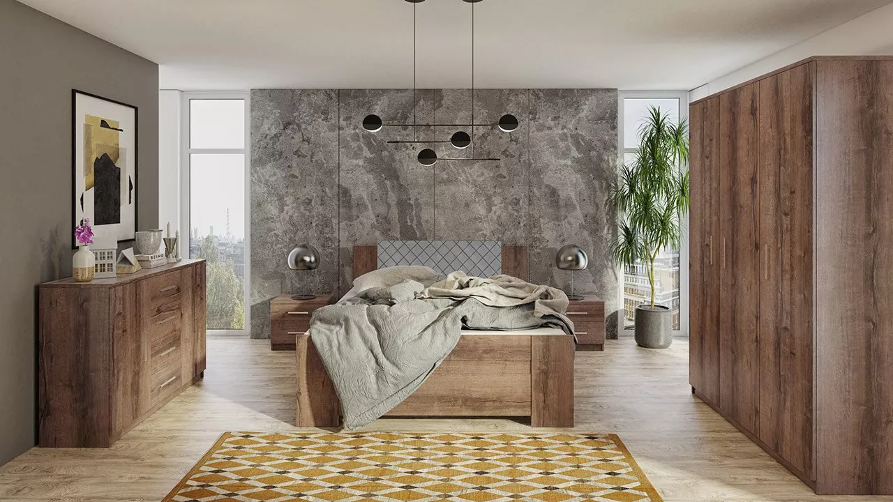 Nábytek do ložnice CORTLAND 8 je funkční sestava vytvořená pro stylové a praktické ložnice a obytné místnosti. Je zachována v jednoduchém a moderním designu a univerzálních barvách. Ložnice je vyrobena z pevných materiálů, které zajistí, že nábytek bude dlouhá léta vypadat jako nový. Prvním prvkem sestavy je kombinovaná komoda, která je vybavena skříńkami s policemi a řadou prostorných zásuvek. Šatní skříň o šířce 135 cm disponuje hlubokými policemi a samostatnou věšákovou zónou vybavenou šatními tyčemi na ramínka. Dalším prvkem jsou dva noční stolky, které jsou vybavené praktickými zásuvkami pro úschovu různých doplňků. Posledním a nezbytným prvkem sestavy je manželská postel o spací ploše 160 x 200 cm. Optimální výška postele 90 cm usnadňuje vstávání z postele a zajišťuje dostatečné větrání matrace. Díky vysoké čalouněné opěrce hlavy získáte měkké a pohodlné opěradlo při večerním odpočinku s knihou. Postel je vybavena úložným prostorem pro lůžkoviny nebo sezónní oblečení.