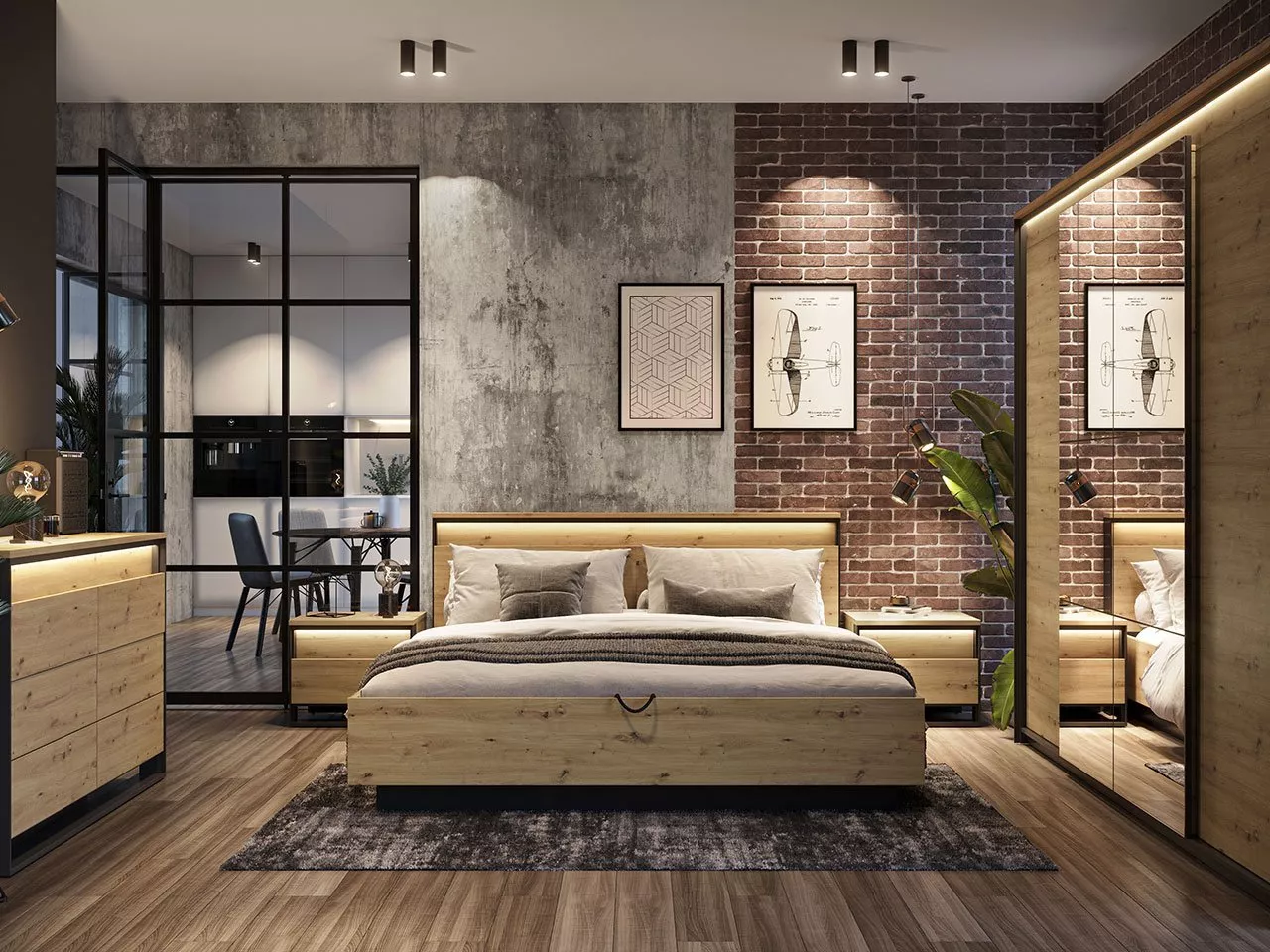 Ložnicová sestava FARN 1 se vyznačuje vysokou kvalitou a stylovým vzhledem. Manželská postel o spací ploše 180x200 cm vám zaručí pohodlný spánek, navíc je vybavena úložným prostorem. Součástí sestavy jsou 2 noční stolky, zásuvková komoda a šatní skříň se zrcadlem. Nábytek je vybaven praktickým bílým LED osvětlením.