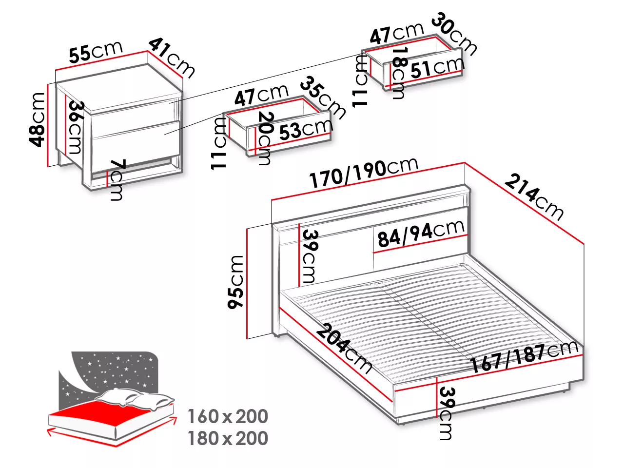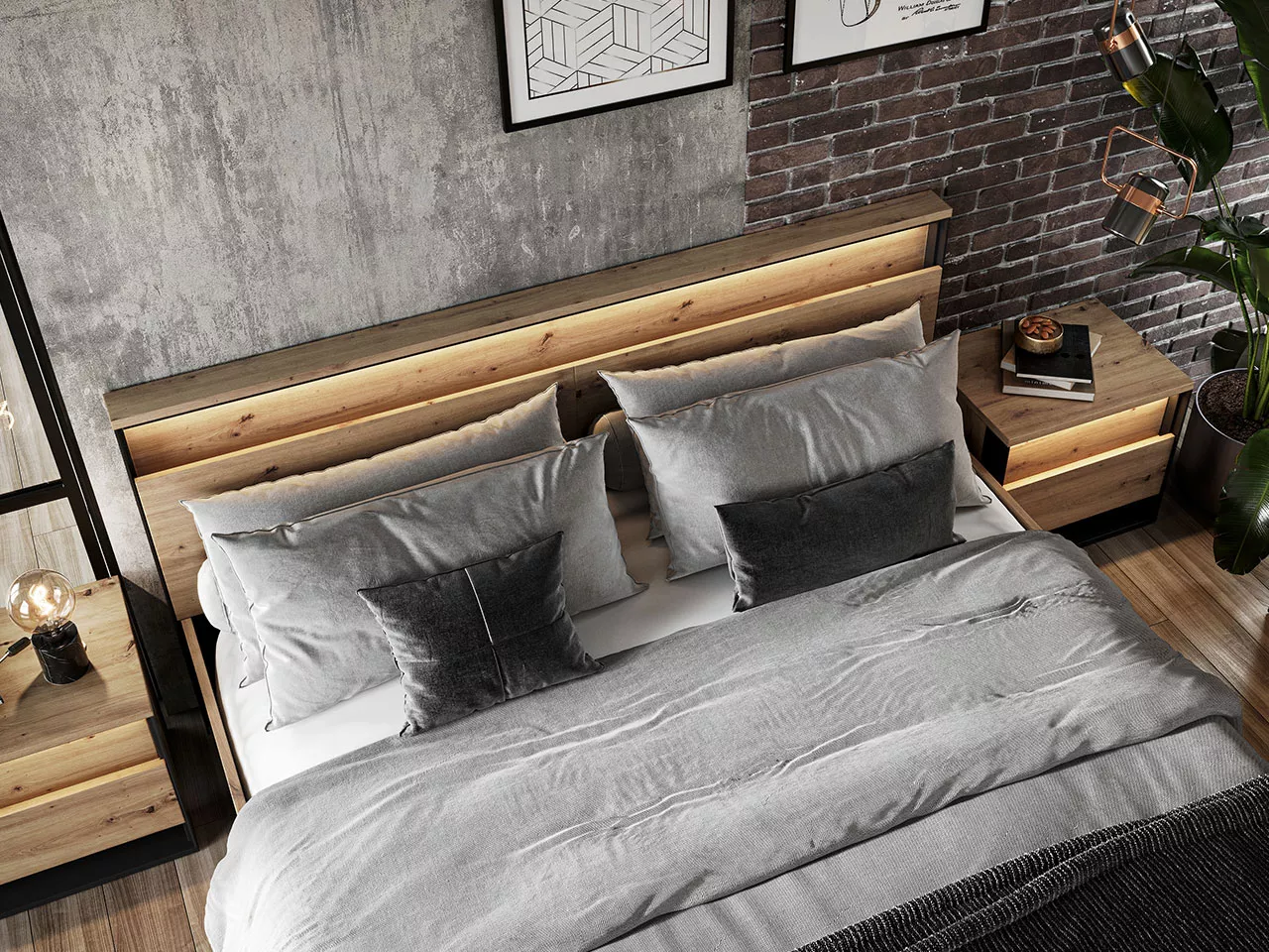 Ložnicová sestava FARN 2 se vyznačuje vysokou kvalitou a stylovým vzhledem. Manželská postel o spací ploše 160x200 cm vám zaručí pohodlný spánek, navíc je vybavena úložným prostorem a LED osvětlením čela. Součástí sestavy jsou 2 noční stolky, taktéž vybavené LED osvětlením.