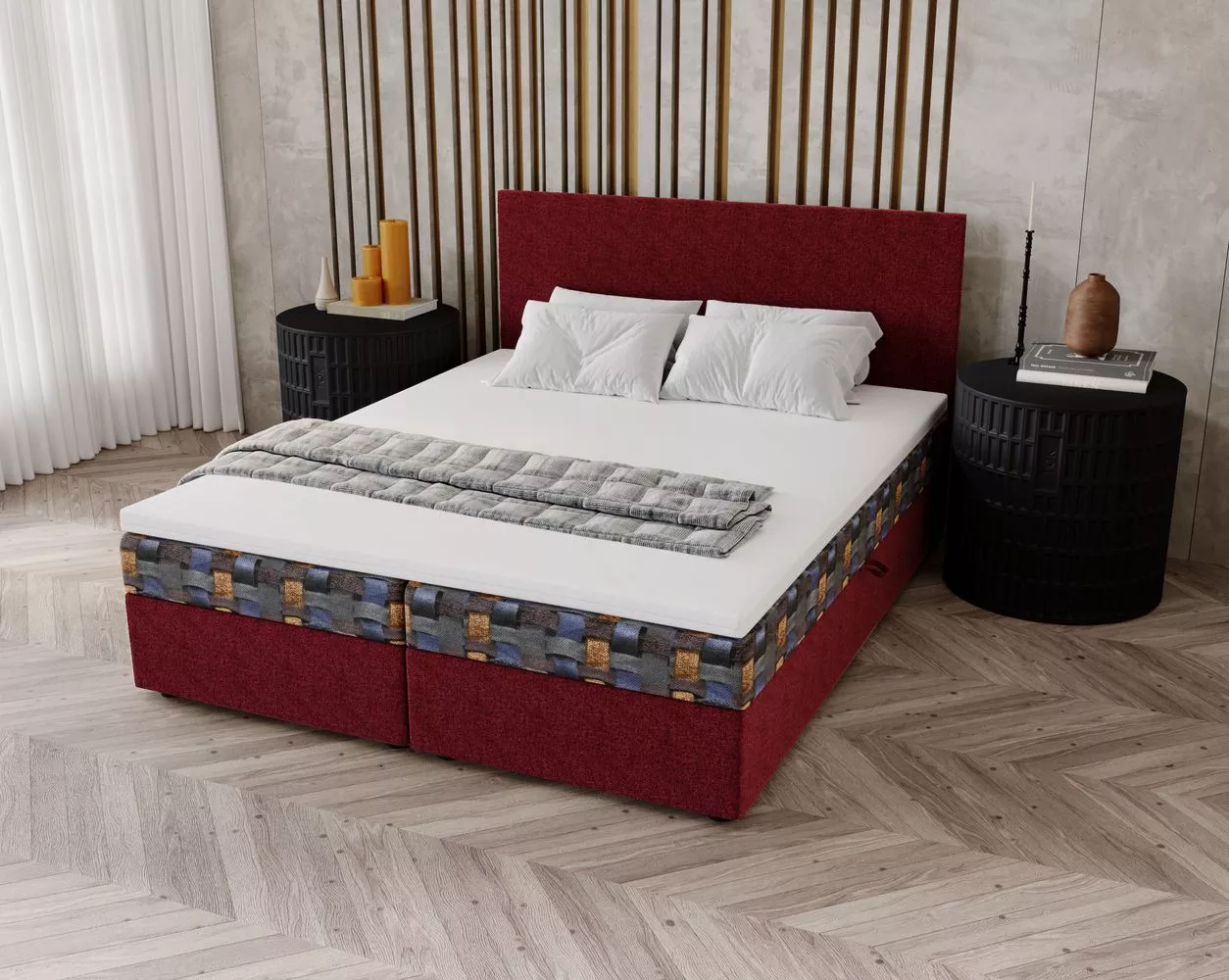 Součástí postele je zabudovaná matrace a úložný prostor. Postel dodáváme bez vyobrazeného topperu. Vhodné modely k dokoupení najdete v sekci Doporučujeme přikoupit.