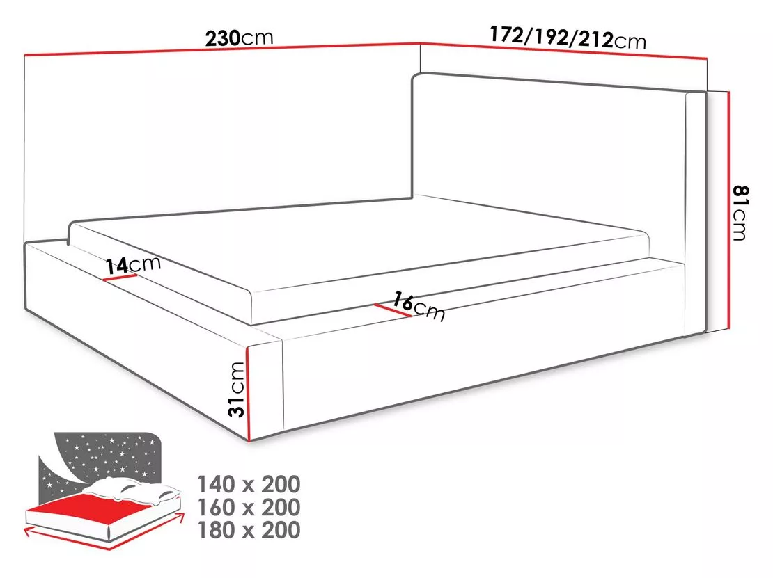 - rozměry úložného prostoru (š/v/h): 141/16/201 cm