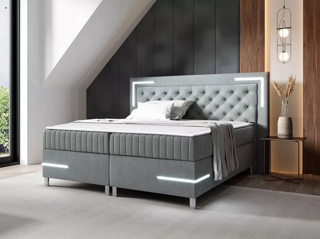 Dvojlůžková kontinentální postel 140x200 BELIA 2 - stříbrná + LED a topper ZDARMA