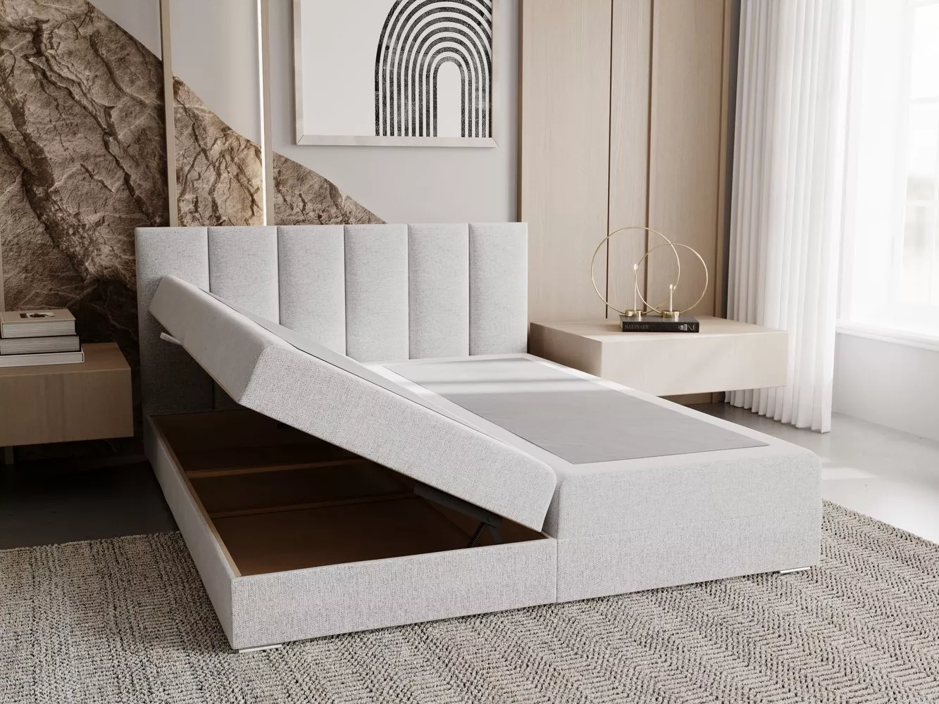Součástí postele je zabudovaná matrace a úložný prostor. Postel dodáváme bez vyobrazeného topperu. Vhodné modely k dokoupení najdete v sekci Doporučujeme přikoupit.