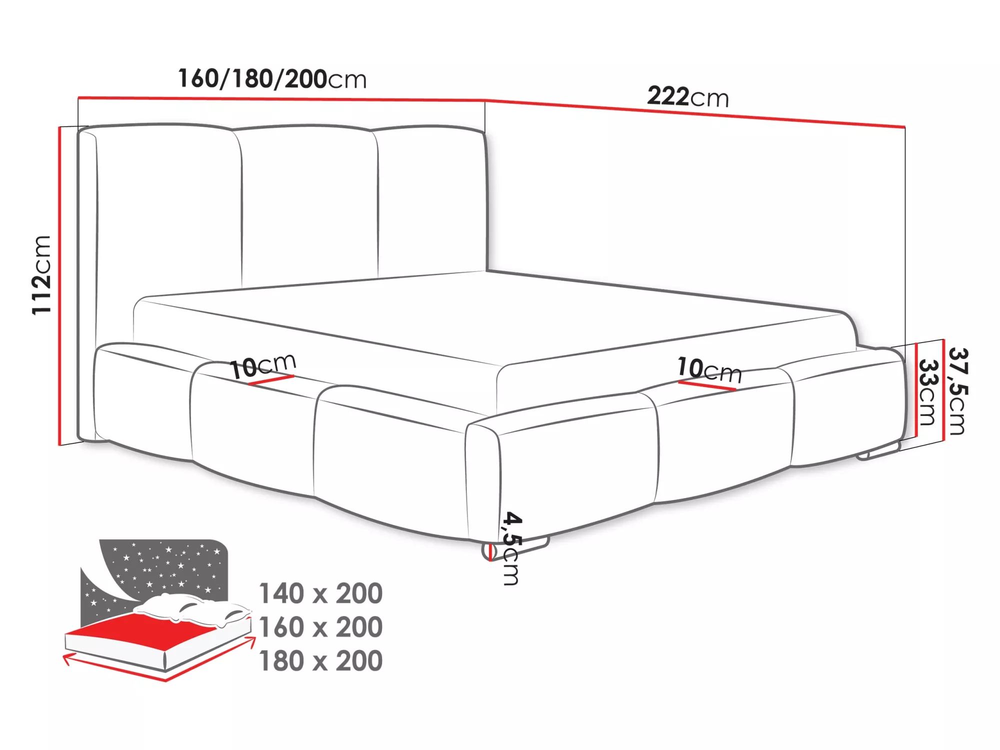 - výška ložné plochy: 37,5 cm