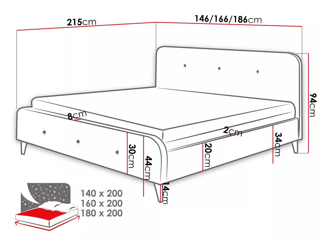 Manželská postel CANDY je stylový a praktický kousek, který perfektně doplní jak moderní, tak skandinávské interiéry. Konstrukce stojí na masivních nohách, které dodávají posteli lehkost a stabilitu. Vysoké čelo navíc zajišťuje maximální komfort při čtení nebo odpočinku.