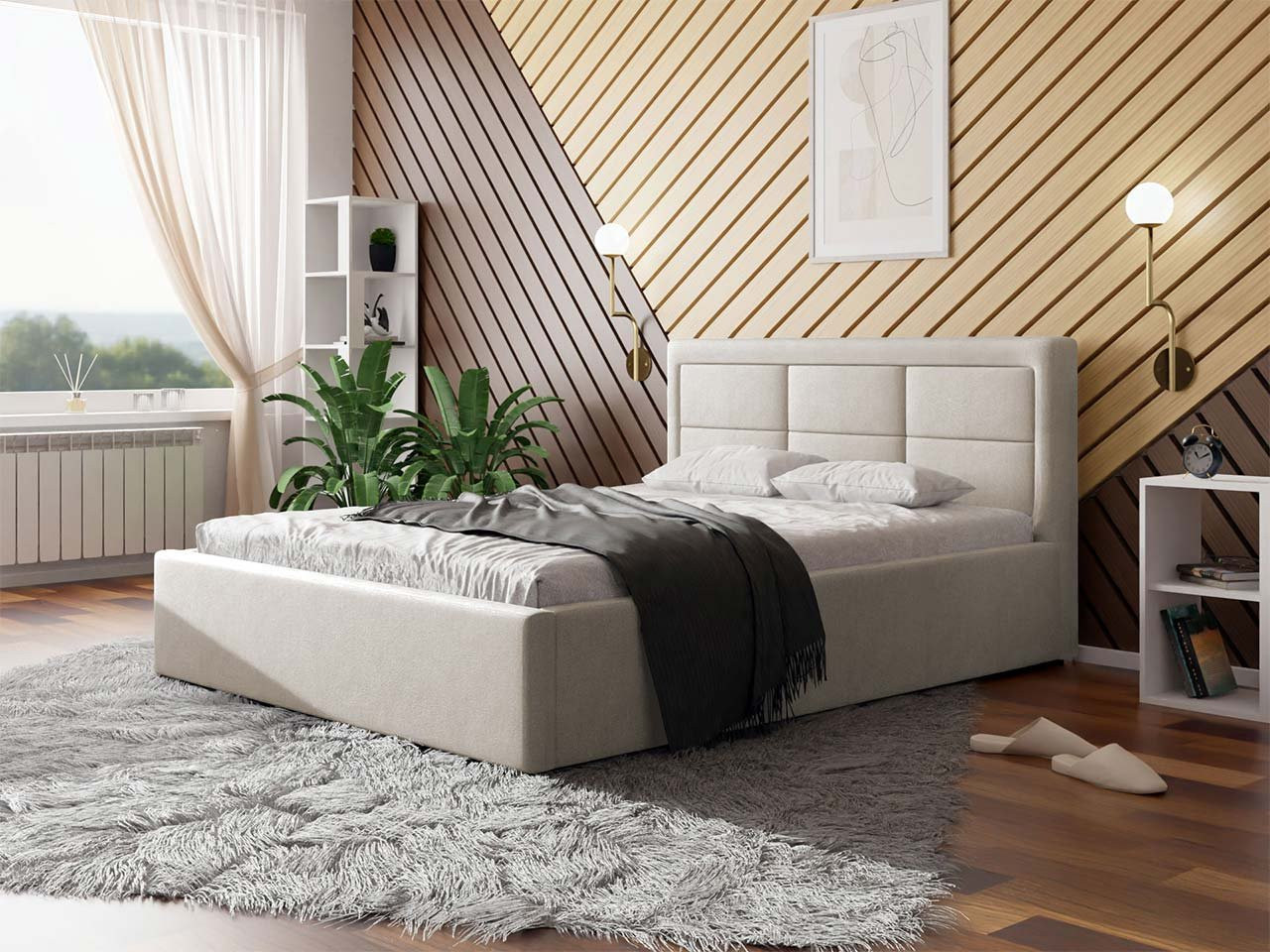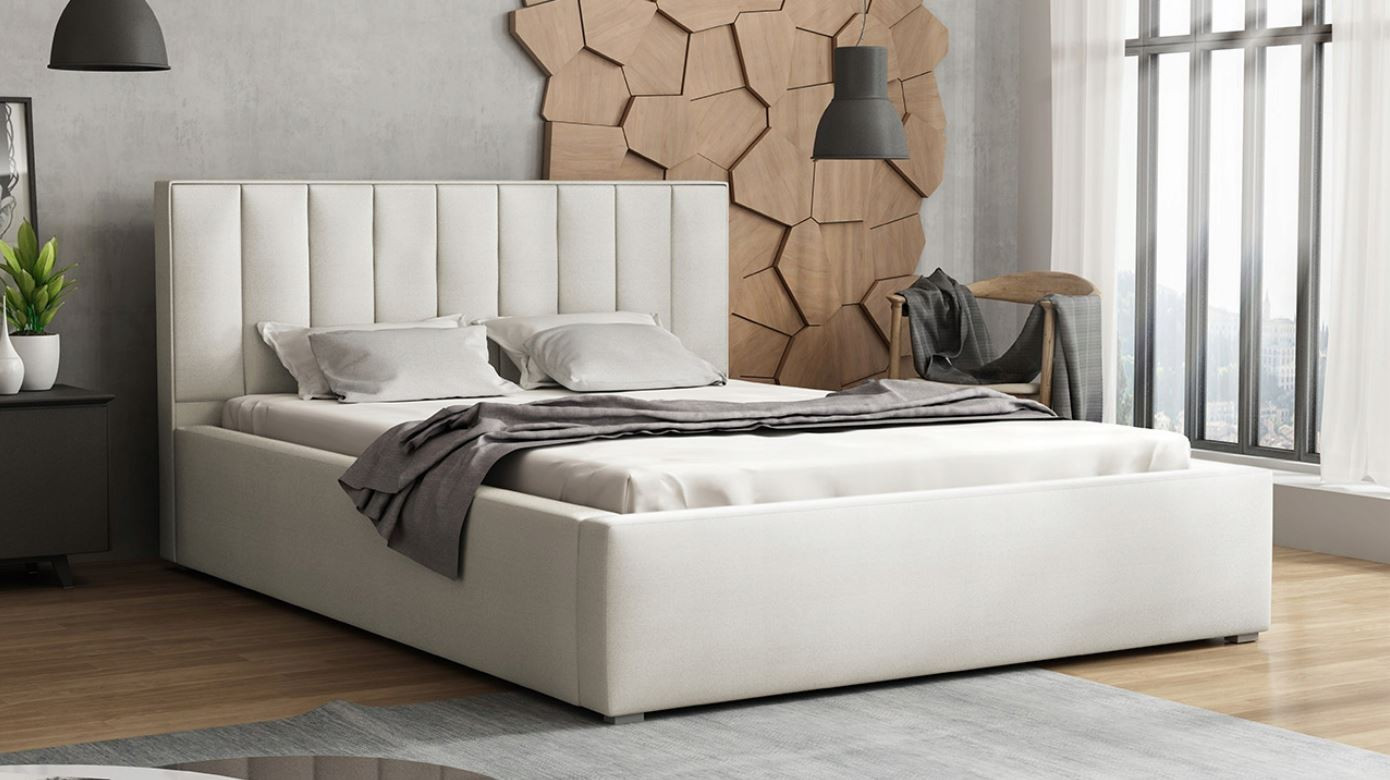 Manželská postel s roštem 140x200 TAISA 4 skvěle zapadne do skandinávských a minimalistických ložnic. Zaujme svým designovým čelem, které zároveň zamezí poškrábání a zašpinění zdi. Postel disponuje úložným prostorem pod vyklápěcím roštem.