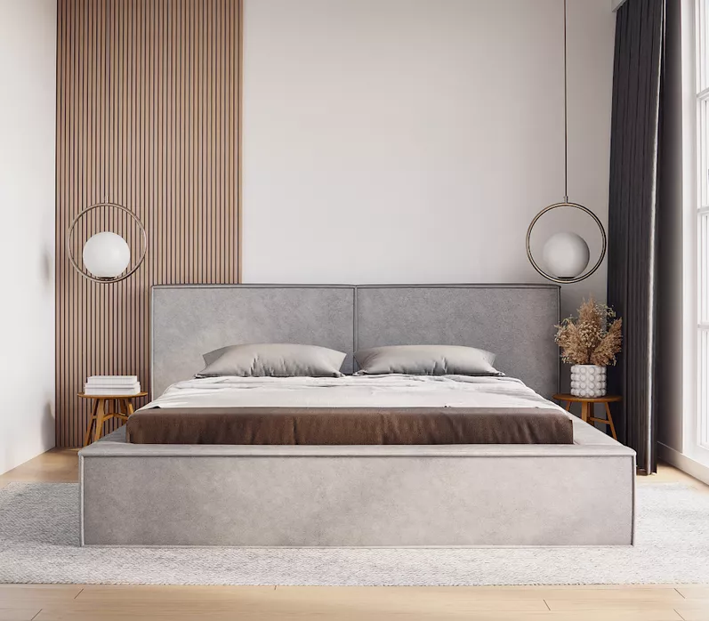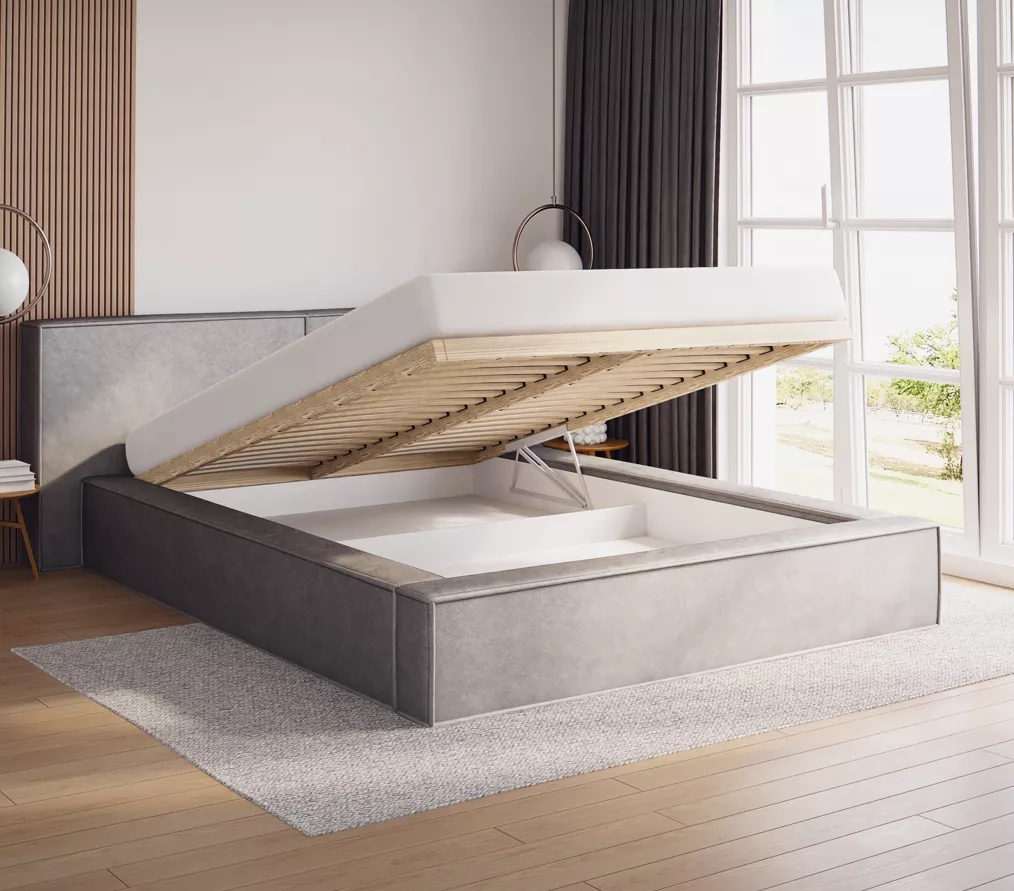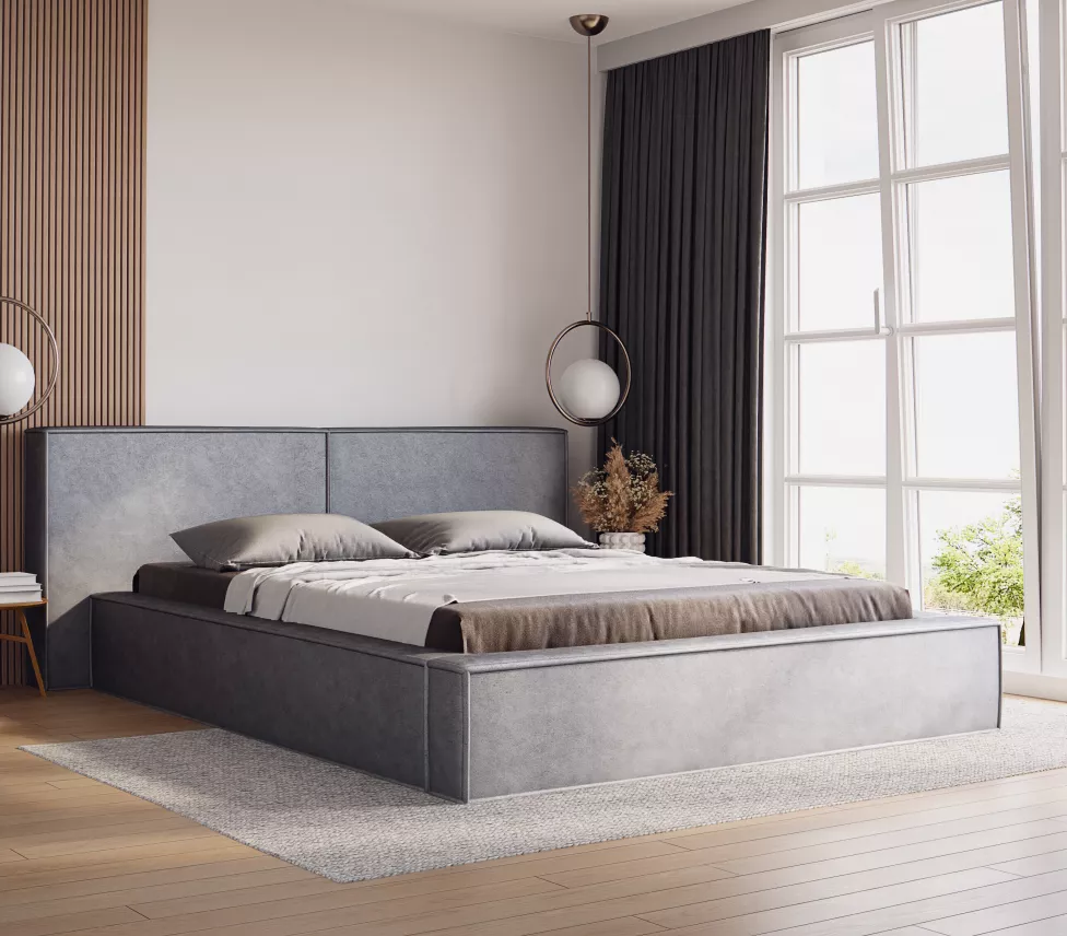 Manželská čalouněná postel TELMA 1 nadchne především svým jednoduchým vzhledem. Je vybavena vyšším čalouněný čelem, které chrání před poškrábáním či znečištěním zdi. Nechybí ani praktický úložný prostor na lůžkoviny.