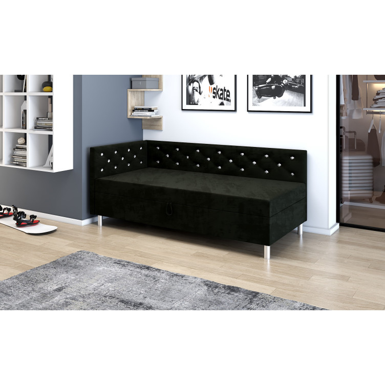 Bytelná čalouněná postel EVELYN je skvělou volbou pro mladé páry i manželé po stříbrné svatbě. Příjemné čalounění celého korpusu včetně čela dodává posteli jemnost, i když uvnitř odpočívá bytelná konstrukce, která snadno unese dva dospělé. Čelo se pyšní jemným prošíváním a dává na odiv esteticky vyvedené obdélníky. Přímo svádí ke čtení oblíbené knihy nebo sledování filmu. Korpus postele je pevně usazený na zdobných stříbrných nožičkách v nohou postele a na druhé straně pečlivě připevněný k majestátnímu čelu o výšce 103 cm. Uvnitř korpusu postele se skví úložný prostor, který je nachystaný schovat náhradní přikrývku i další povlečení a polštáře. Shora na korpusu leží vestavěný rošt na kvalitně vyvedených pantech. Díky tomu je úložný prostor dobře dostupný od noh postele.