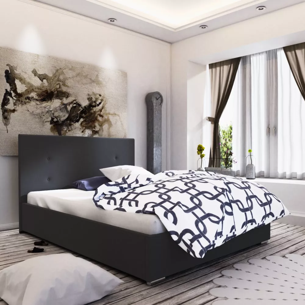 Čalouněná manželská postel Flek. Moderní design a jednoduché linie. Luxusní čelo u hlavy se tyčí až do výšky 110 cm a je jako dělané k pohodlnému opření při čtení nebo sledování televize či večerní práci s PC. Čelo je příjemně měkké, zdobené jemným prošíváním. Kovové stříbrné nožičky dodávají posteli ladnost a šmrnc. Rošt i matrace k dokoupení naleznete níže.