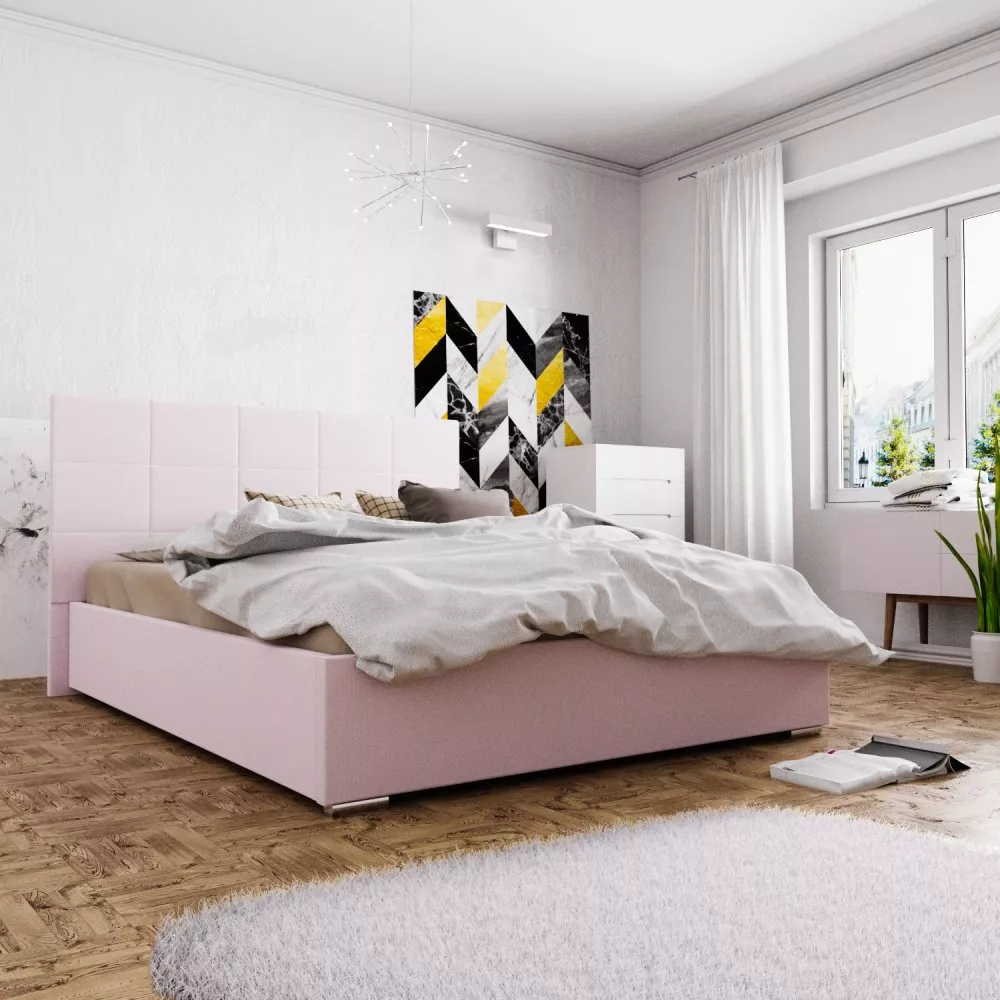 Čalouněná manželská postel Flek. Moderní design a jednoduché linie. Luxusní čelo u hlavy se tyčí až do výšky 110 cm a je jako dělané k pohodlnému opření při čtení nebo sledování televize či večerní práci s PC. Čelo je příjemně měkké, zdobené jemným prošíváním. Kovové stříbrné nožičky dodávají posteli ladnost a šmrnc. Rošt i matrace k dokoupení naleznete níže.