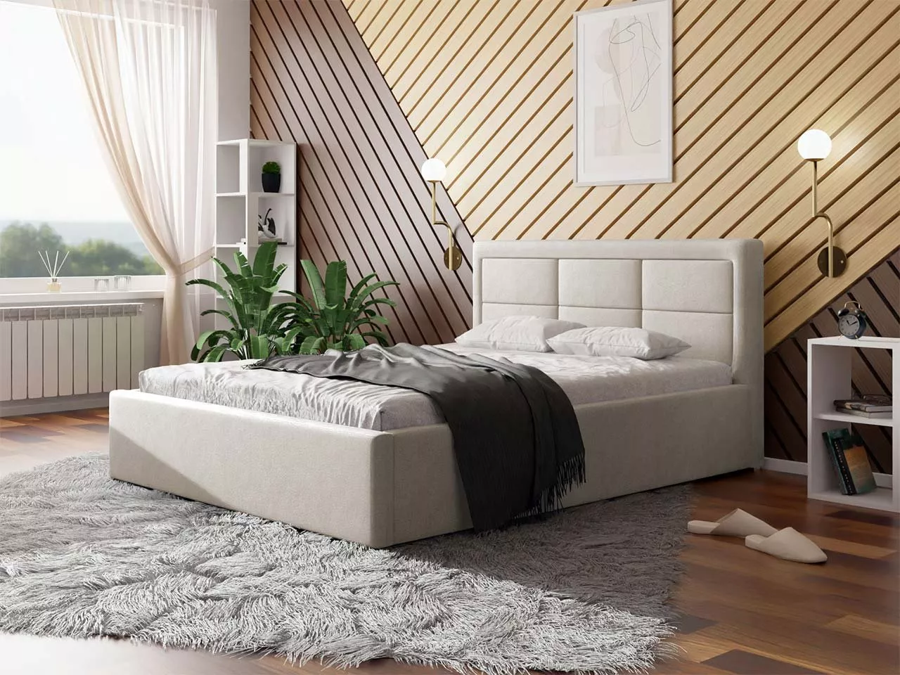 Manželská postel PALIGEN 2 o spací ploše 140x200 cm se vyznačuje měkkým čelem s ozdobným prošíváním. Pevná kovová konstrukce roštu zajistí stabilitu postele, zatímco měkké pěnové hrany eliminují riziko bolestivého nárazu. Samozřejmostí je dvoukomorový úložný prostor na lůžkoviny.