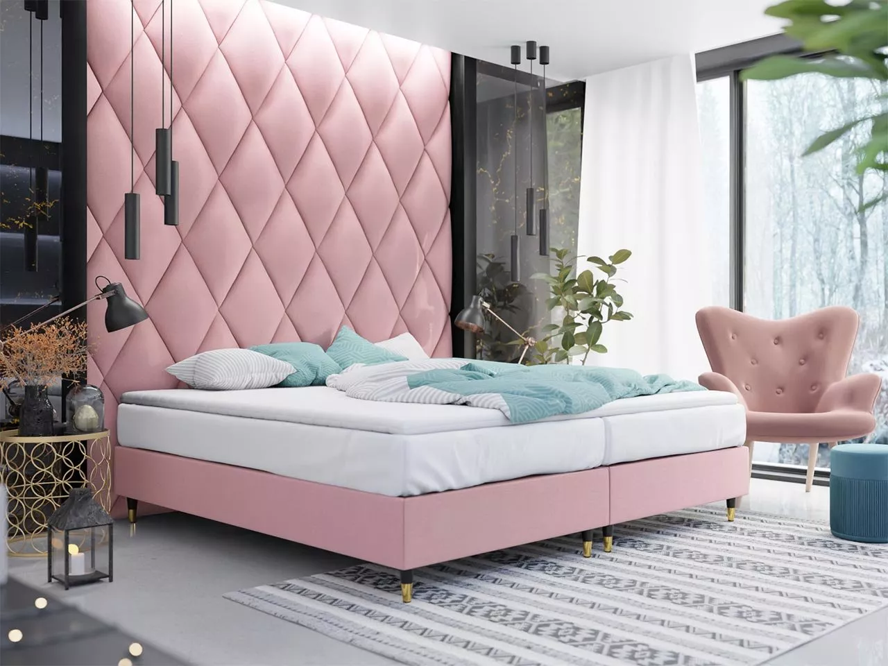 Postel dodáváme bez vyobrazených nástěnných panelů. Vhodné panely k dokoupení naleznete v sekci Čalouněné nástěnné panely.