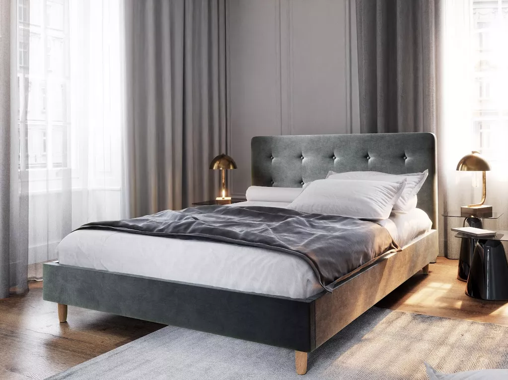 Čalouněná manželská postel NOOR se hodí do všech moderních ložnic. Čalouněné čelo zamezí poškrábání a zašpinění zdi.