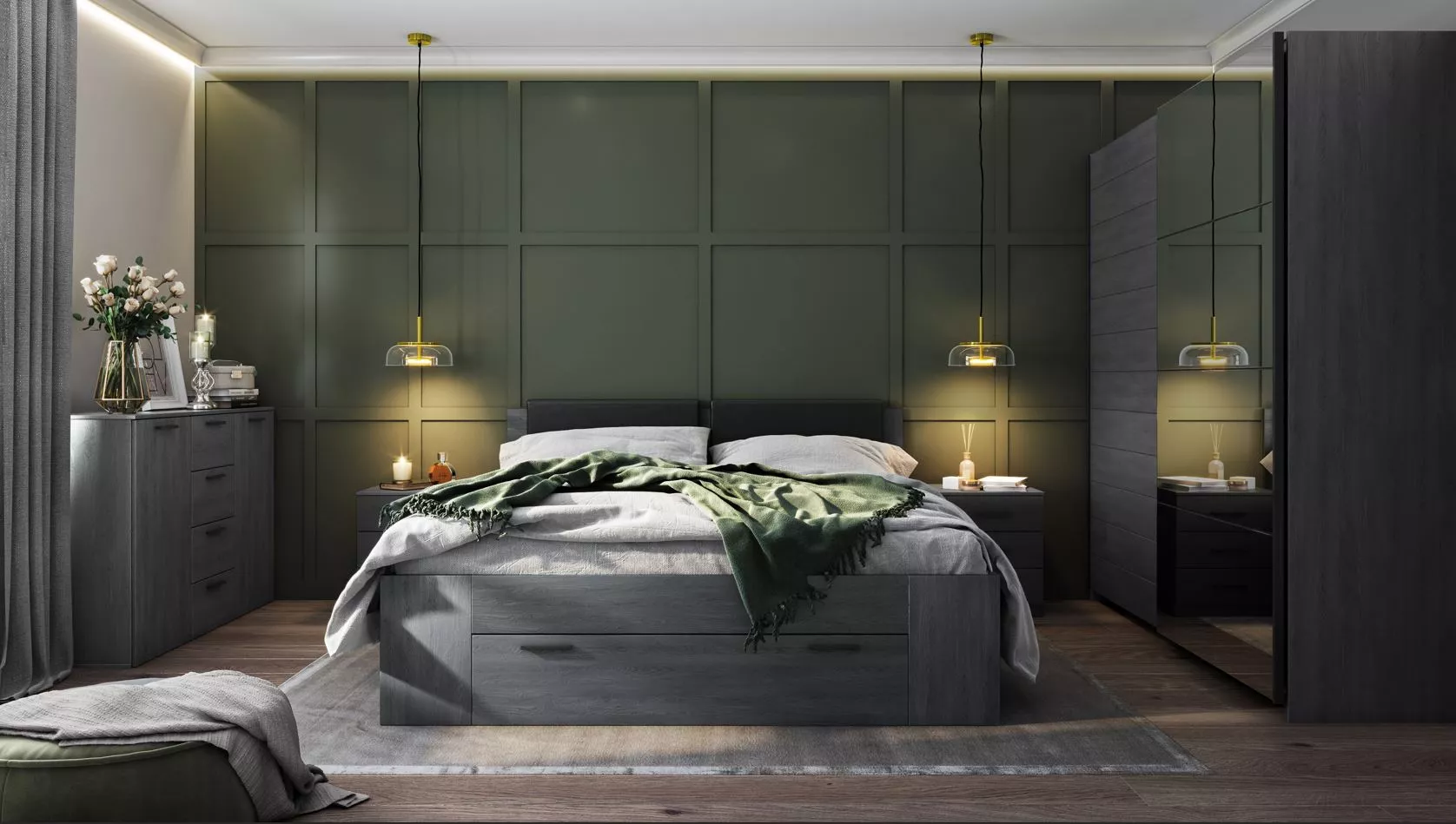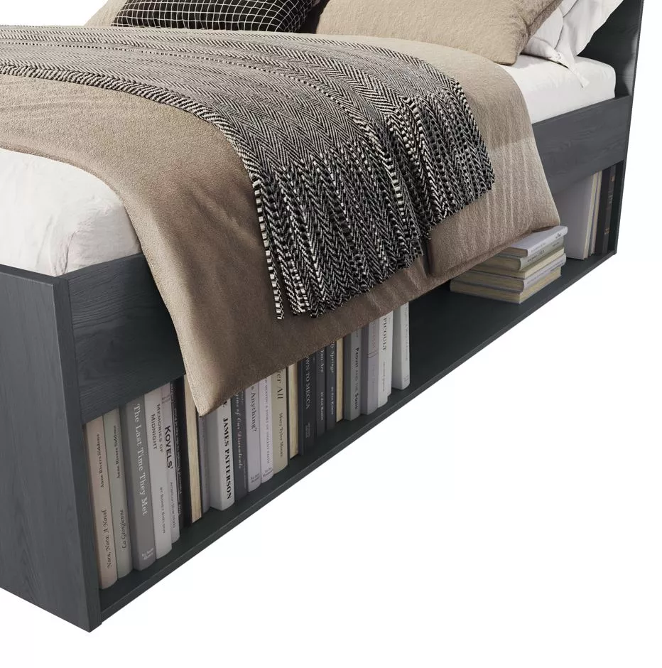Manželská postel CROSBY o spací ploše 140x200 cm je dokonalým centrem klidu a pohodlí ve vaší ložnici. Měkké čelo poskytuje pohodlí, a zároveň dodává prostoru elegantní vzhled. Praktický šuplík je skvělé řešení pro ukládání ložního prádla. Na obou stranách pak najdete poličky určené pro knihy nebo drobné předměty, které chcete mít po ruce před spaním.
