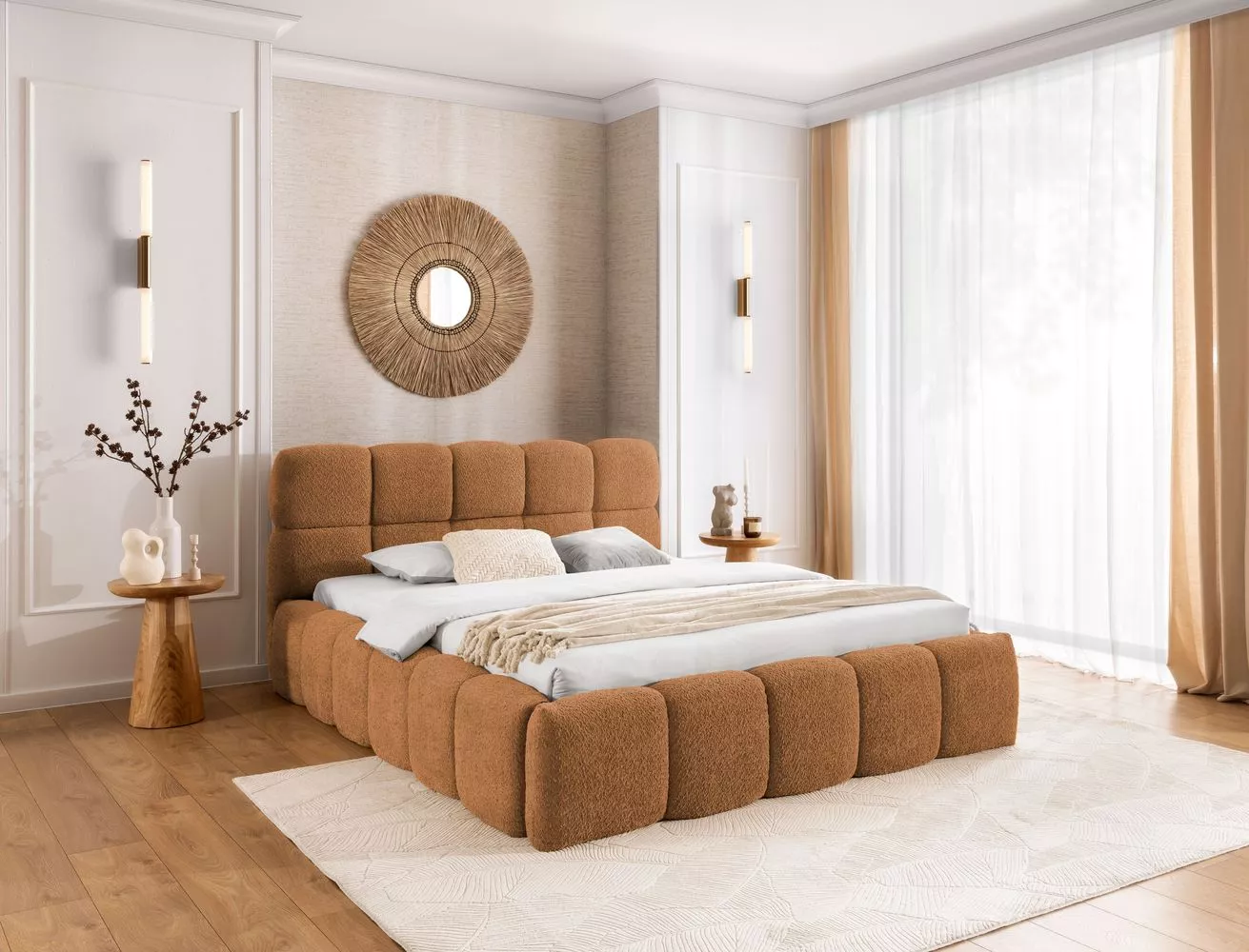 Manželská čalouněná postel 140x200 ZOUZETE se hodí do moderních pokojů či ložnic. Čelo postele slouží jako opora zad, která zajišťuje pohodlný odpočinek vsedě, pokud si například chcete v posteli číst knihu nebo vypít ranní kávu. Úložný prostor je otevíraný z boku.
