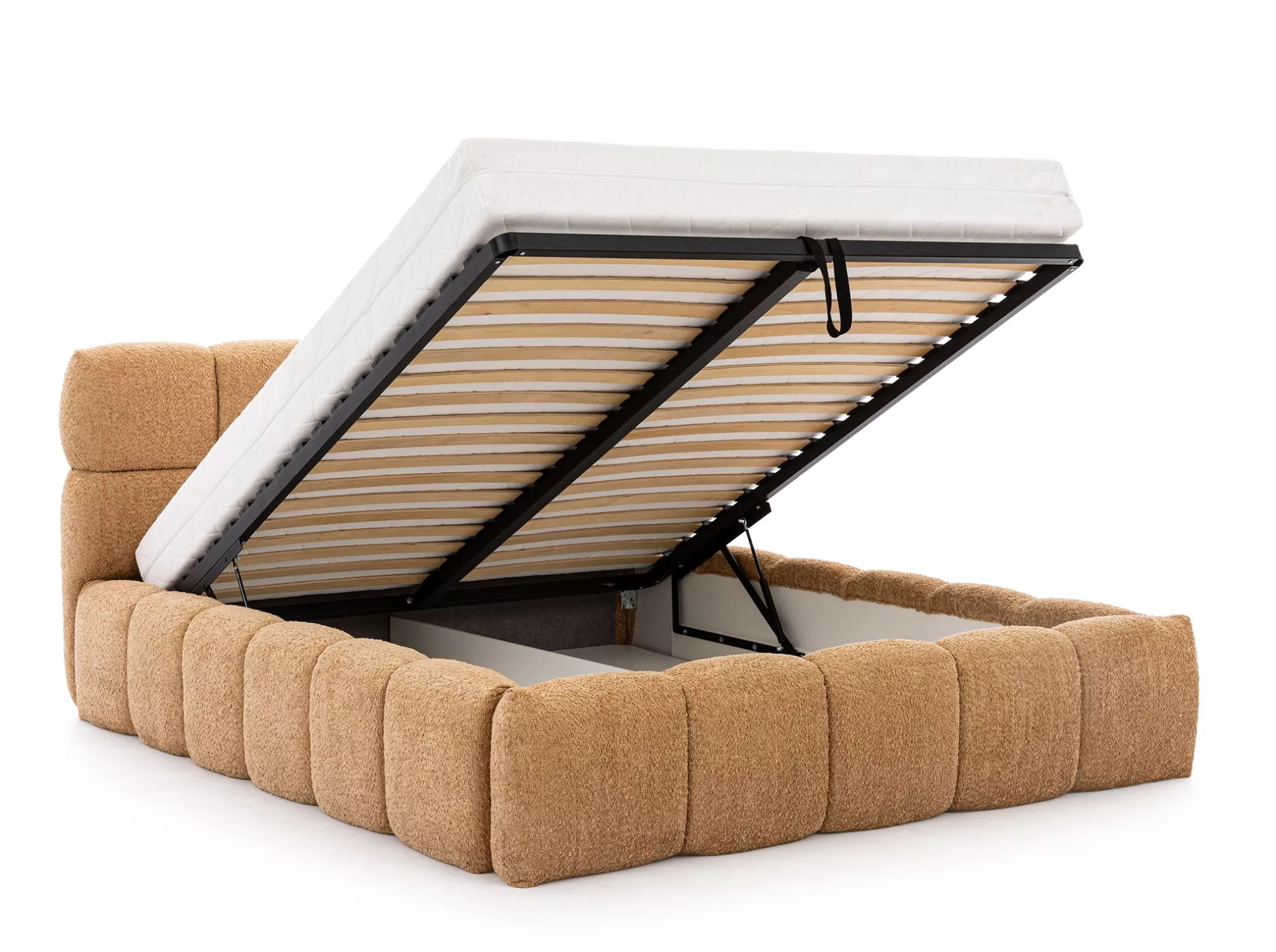 Manželská čalouněná postel 180x200 ZOUZETE se hodí do moderních pokojů či ložnic. Čelo postele slouží jako opora zad, která zajišťuje pohodlný odpočinek vsedě, pokud si například chcete v posteli číst knihu nebo vypít ranní kávu. Úložný prostor je otevíraný z boku.